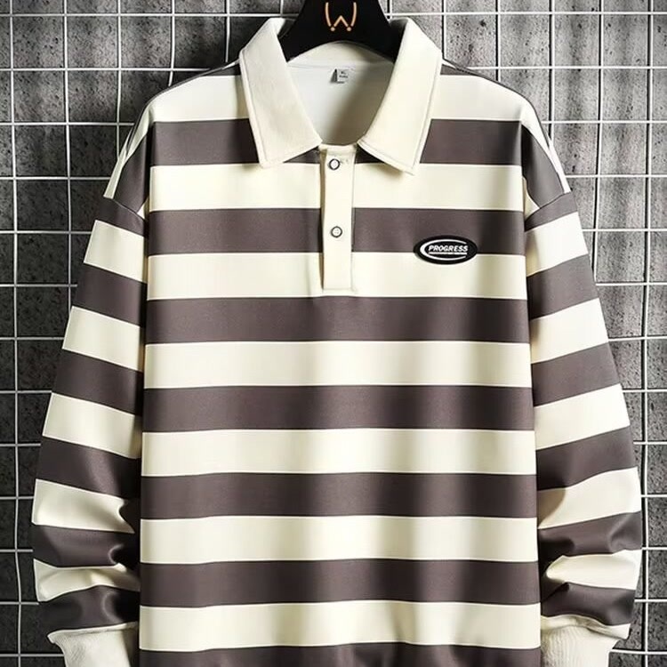 가로 줄무늬 긴팔 티셔츠 남자 봄과 가을 2025 새로운 느슨한 대외 무역 옷깃 폴로 셔츠 남자 풀오버 스웨터