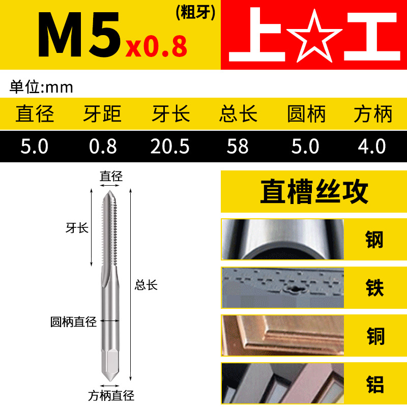 상단 작업 탭 탭 고속 강철 기계 탭 상단 작업 스트레이트 플루트 탭 헤드 콘 하단 콘 M3M4M5M6M8M10스토어 가기