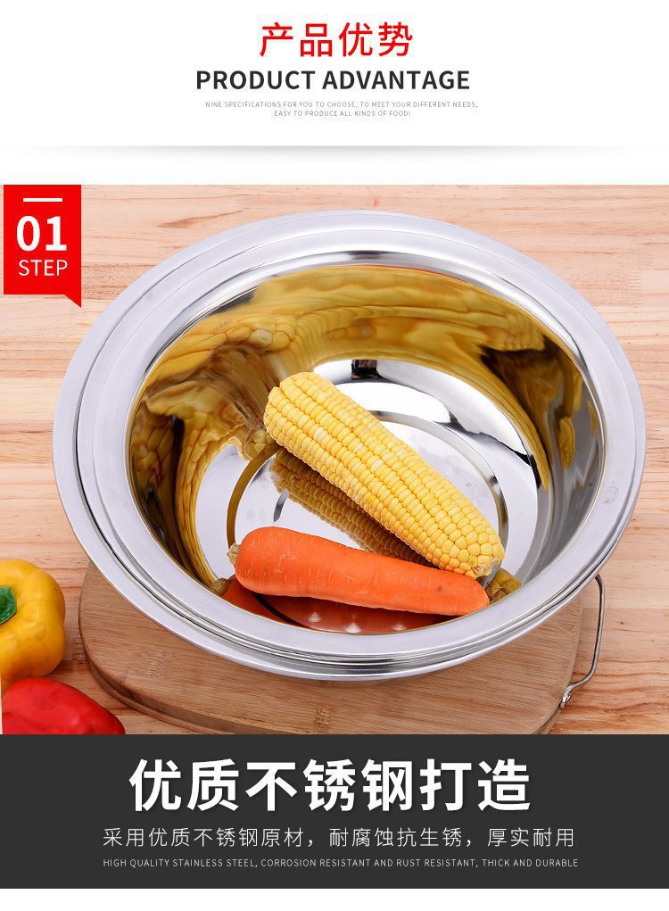 식품 학년 스테인레스 스틸 분지 가정용 주방 계란 및 얼굴 분지 야채 세척 베이킹 큰 분지 두꺼운 수프 분지스토어 가기