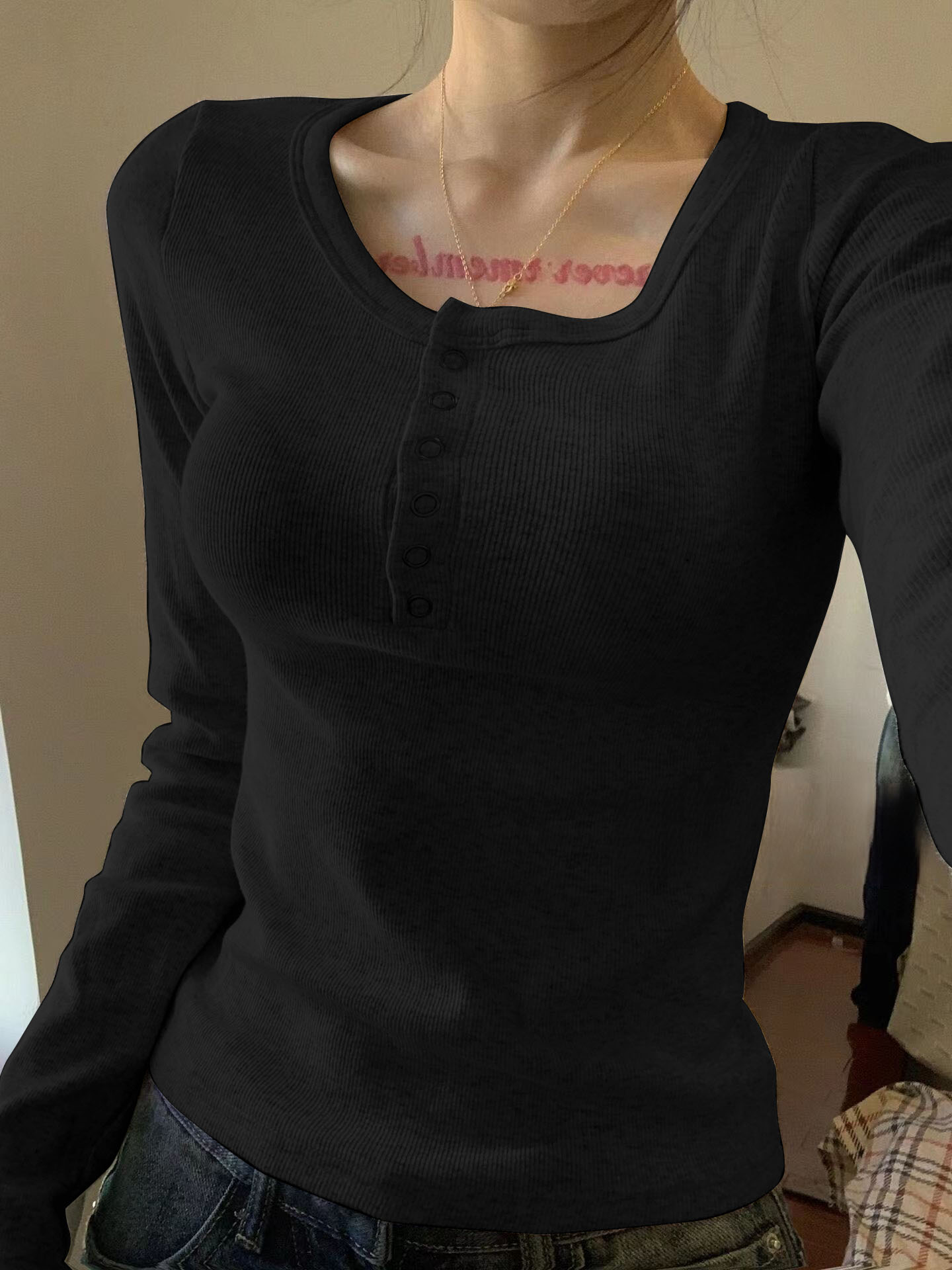 봄과 가을 회색 실 어깨 긴팔 티셔츠 여성용 플러스 사이즈 통통녀 슬림 핏 슬리밍 버클베이스 셔츠 내부 탑