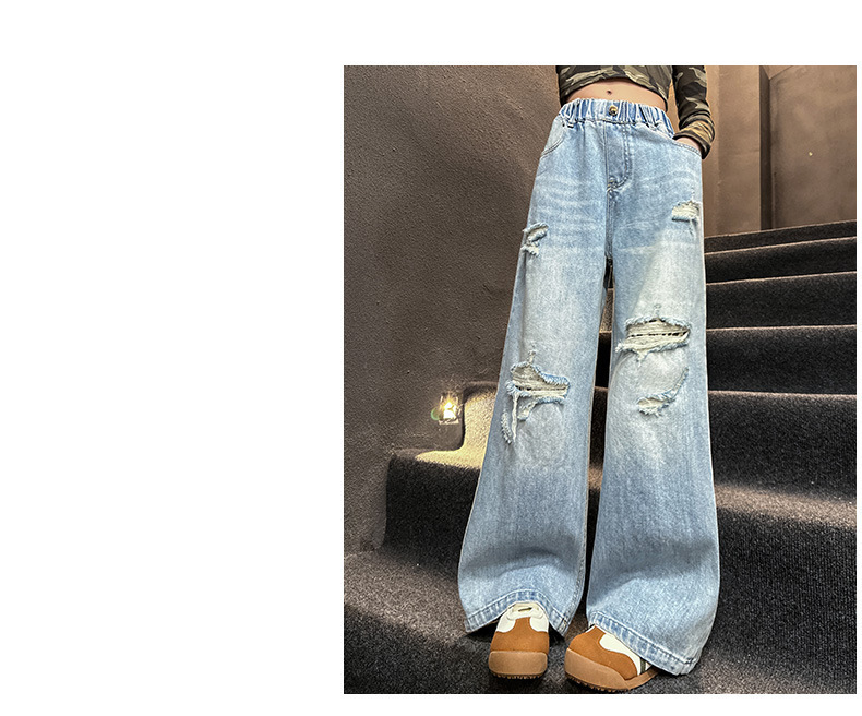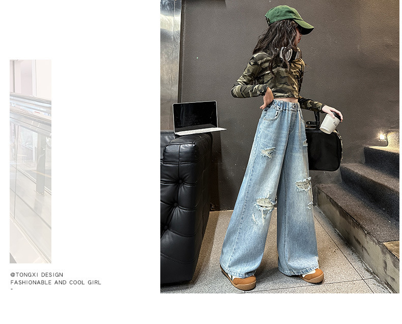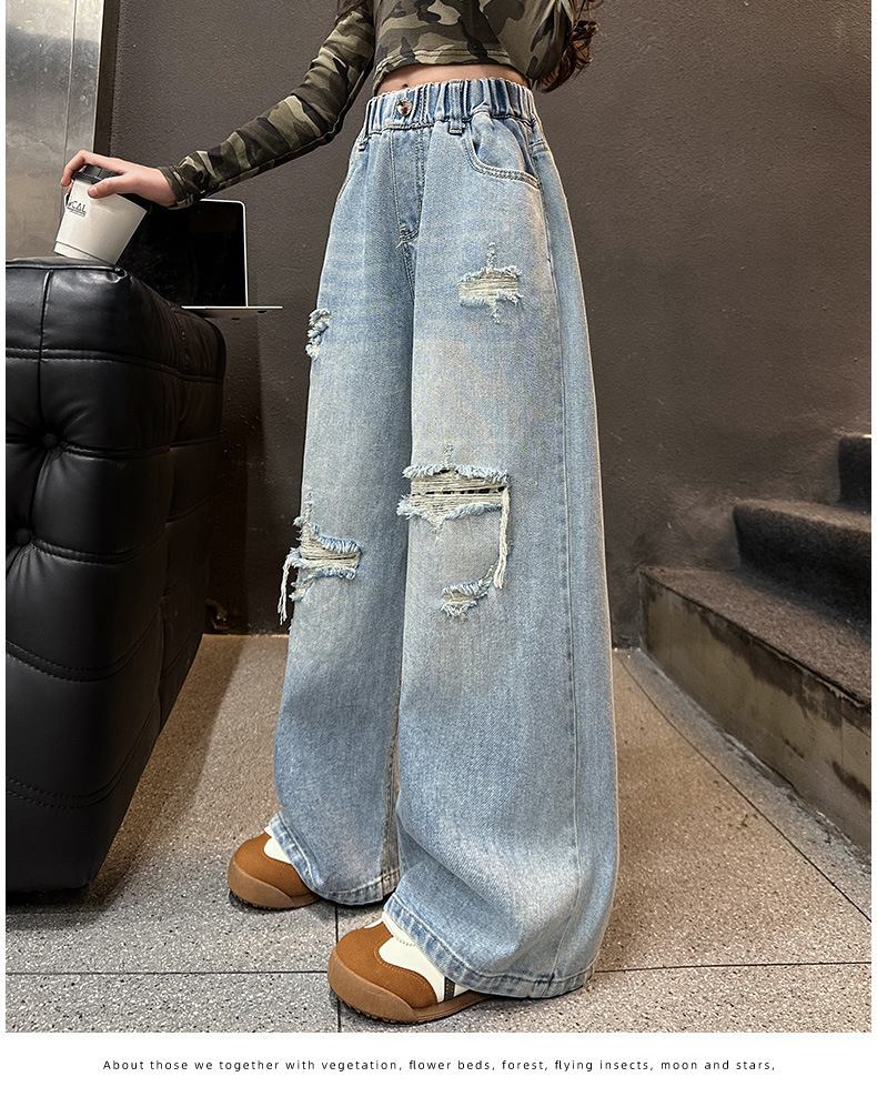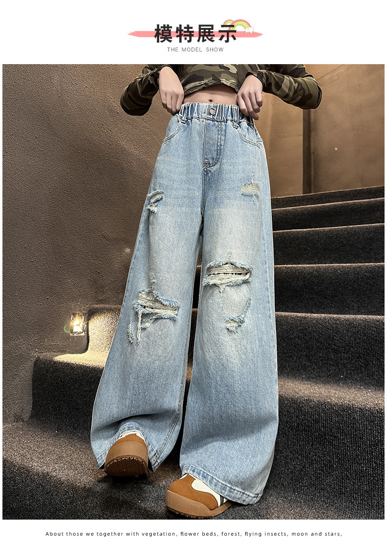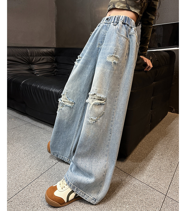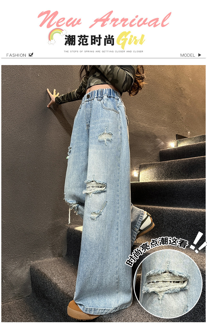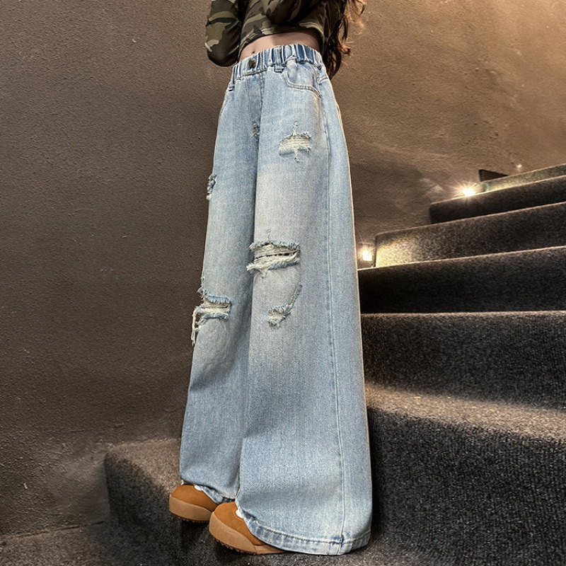 국경 간 소녀 청바지 2025 봄 새로운 스타일 중대형 어린이 스트레이트 웨스턴 스타일 유행 긴 캐주얼 바지 구멍스토어 가기