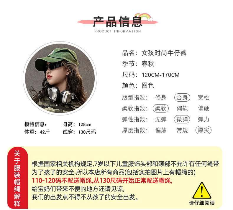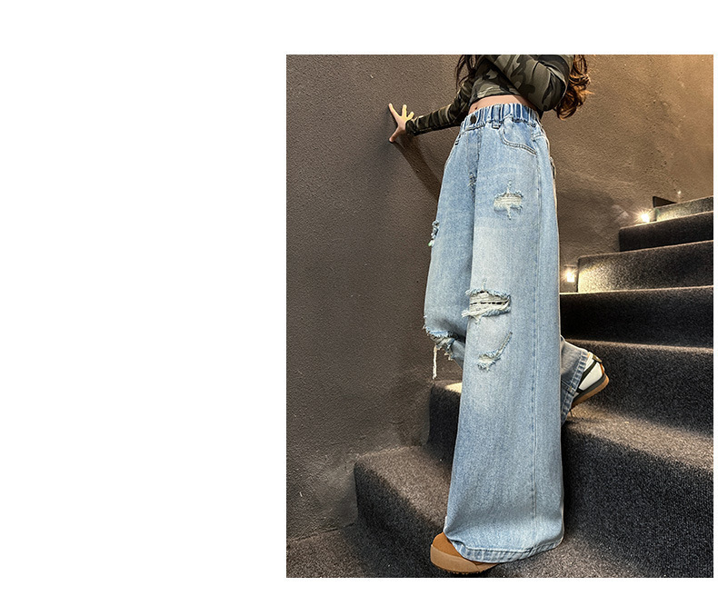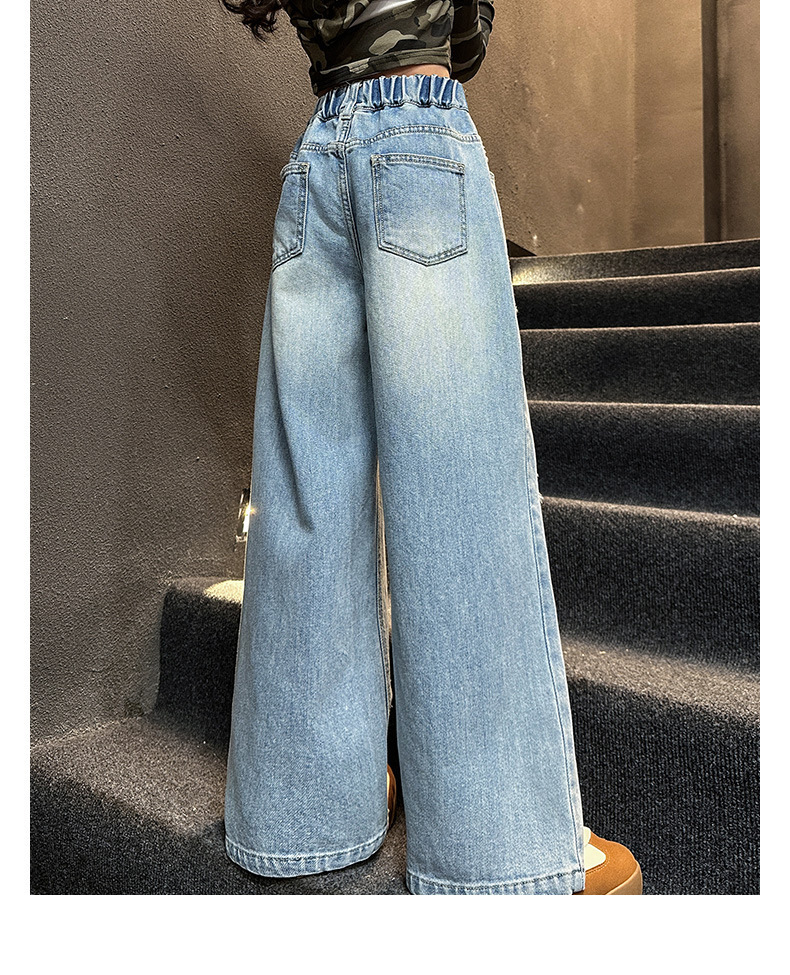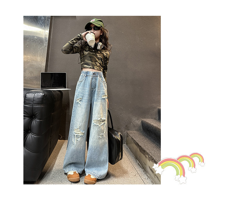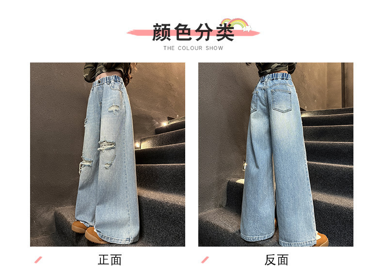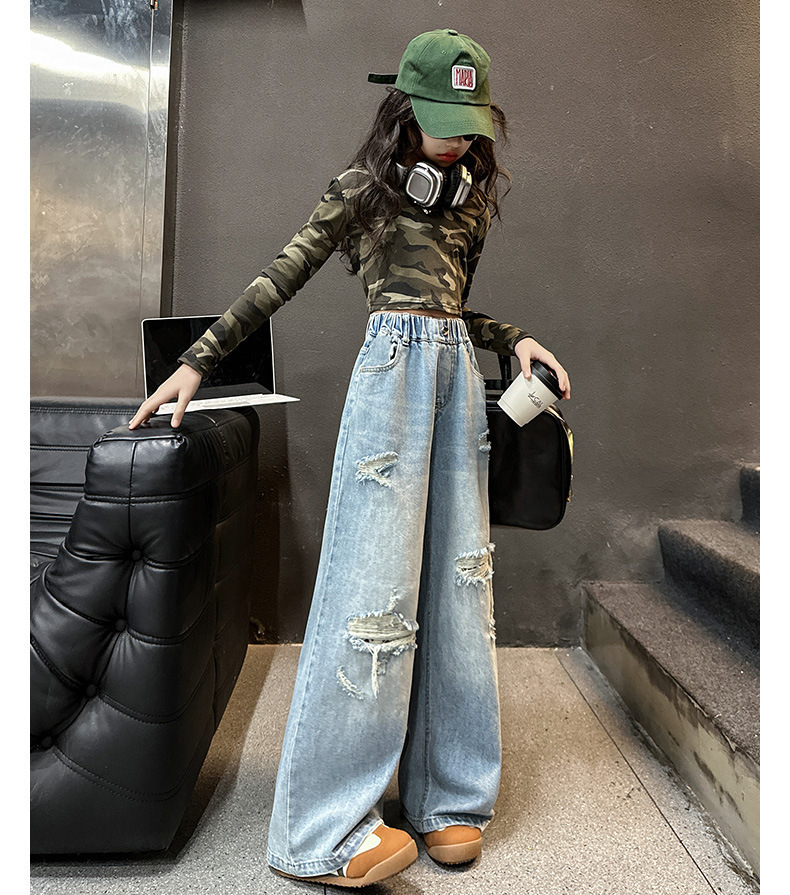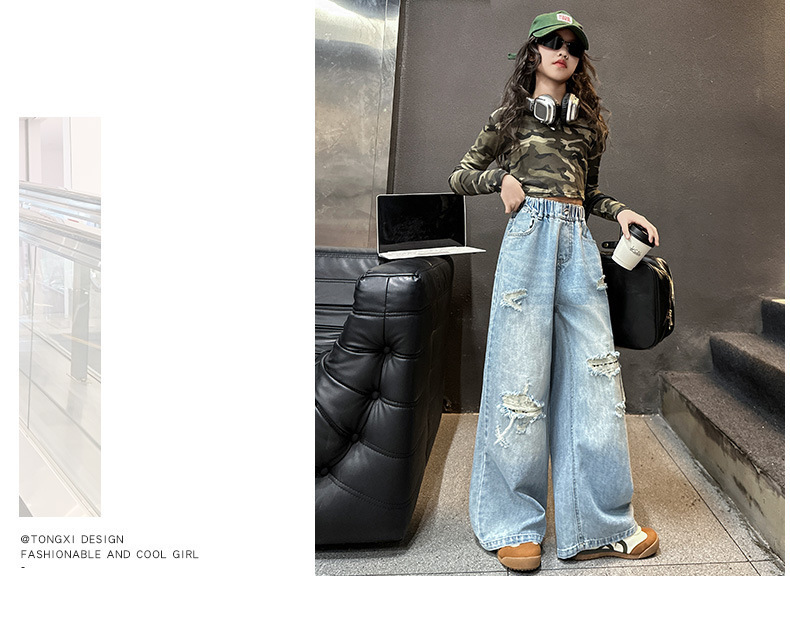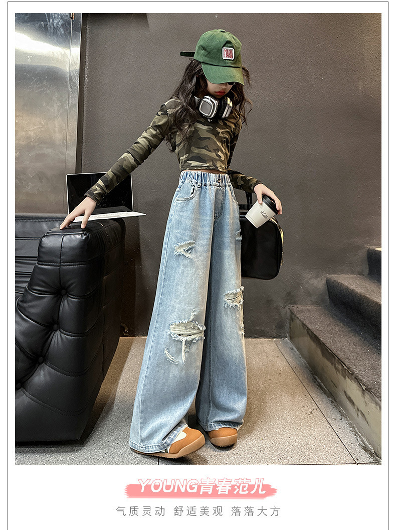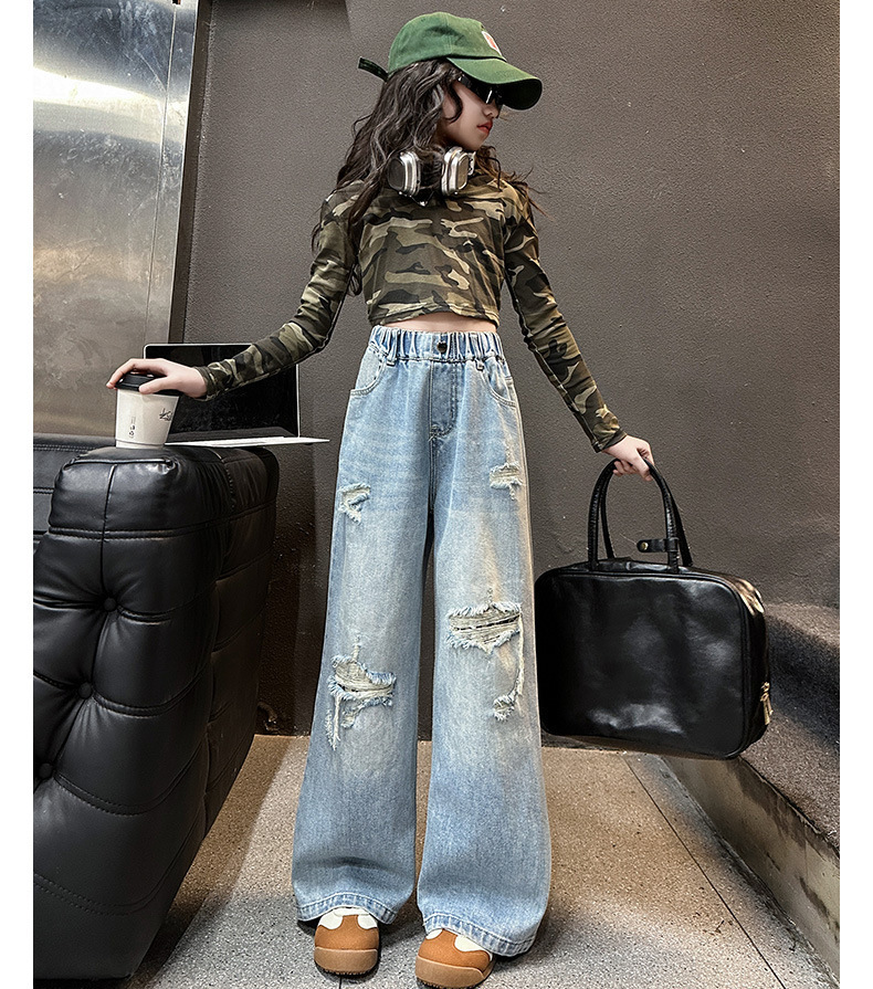 국경 간 소녀 청바지 2025 봄 새로운 스타일 중대형 어린이 스트레이트 웨스턴 스타일 유행 긴 캐주얼 바지 구멍스토어 가기
