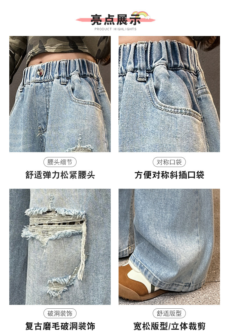 국경 간 소녀 청바지 2025 봄 새로운 스타일 중대형 어린이 스트레이트 웨스턴 스타일 유행 긴 캐주얼 바지 구멍