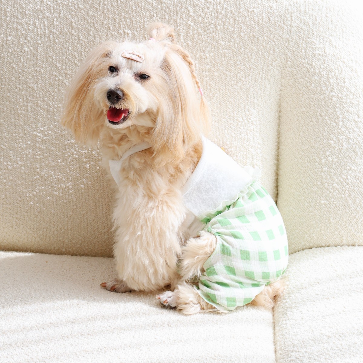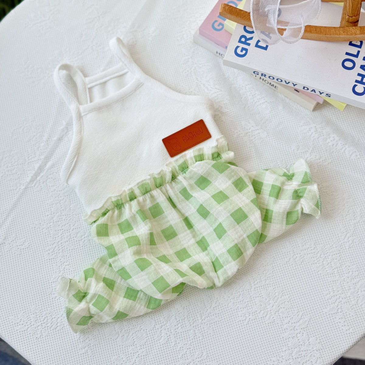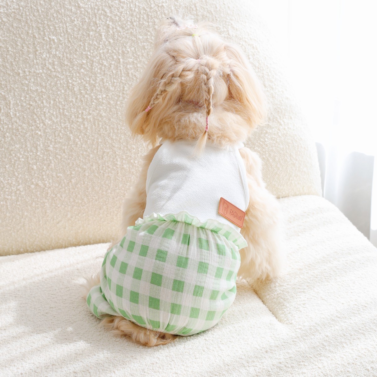 고양이와 강아지 모두를 위한 봄여름용 녹색과 갈색 투톤 가죽 라벨 패션 꽃봉오리 디자인의 가볍고 얇은 원피스 점프수트스토어 가기