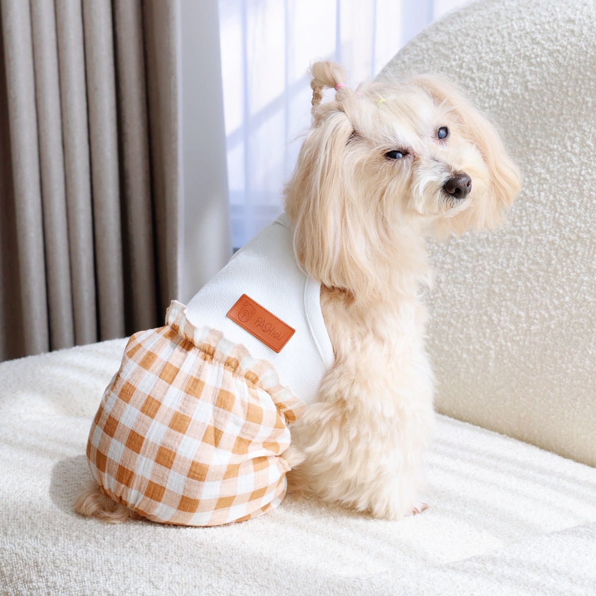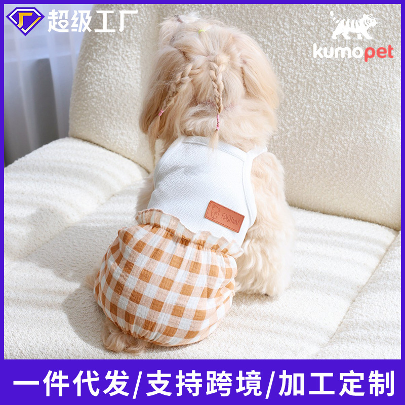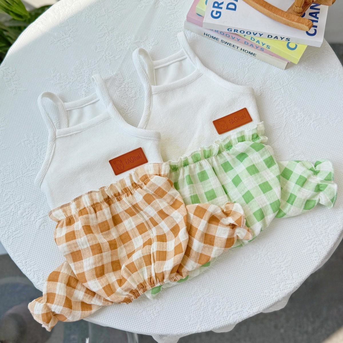 고양이와 강아지 모두를 위한 봄여름용 녹색과 갈색 투톤 가죽 라벨 패션 꽃봉오리 디자인의 가볍고 얇은 원피스 점프수트스토어 가기
