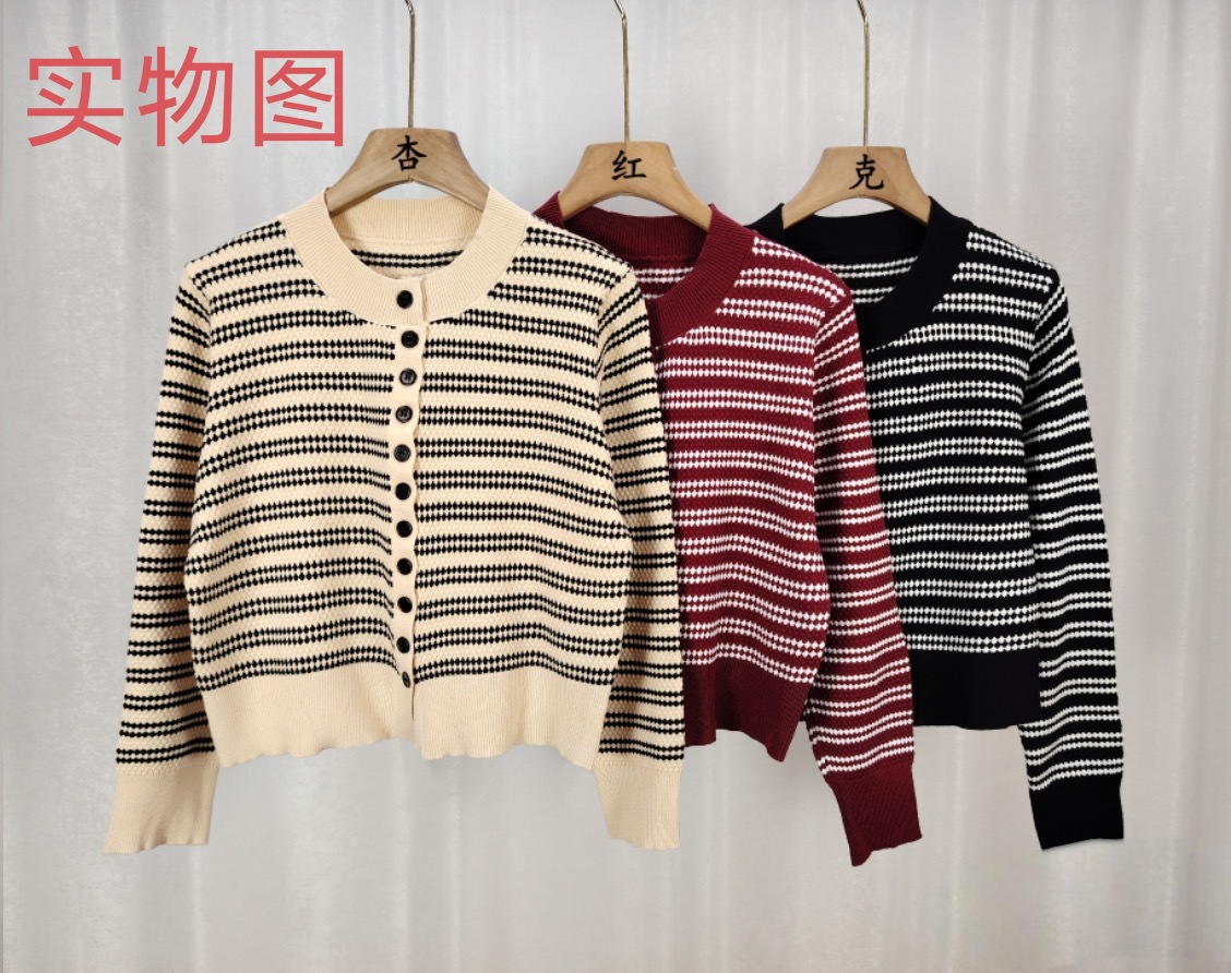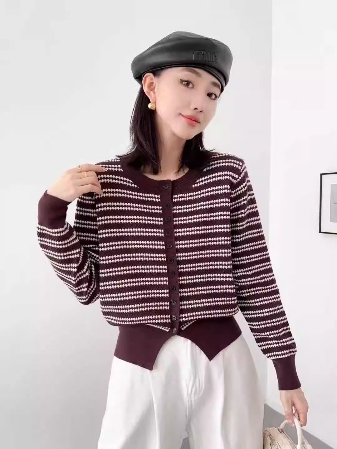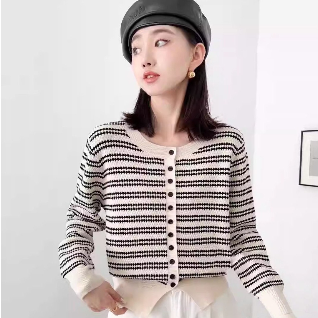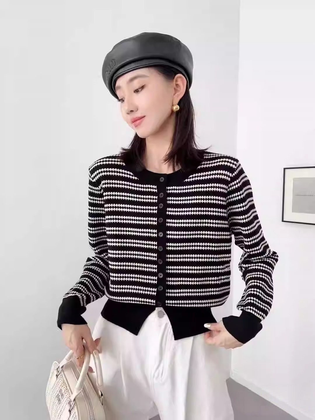 유행 서양식 줄무늬 긴 소매 니트 카디건 여성의 봄과 가을 새로운 우아한 분할 세련된 쇼트 탑 재킷스토어 가기