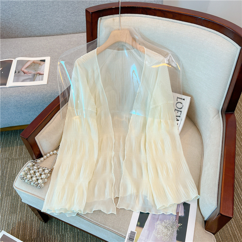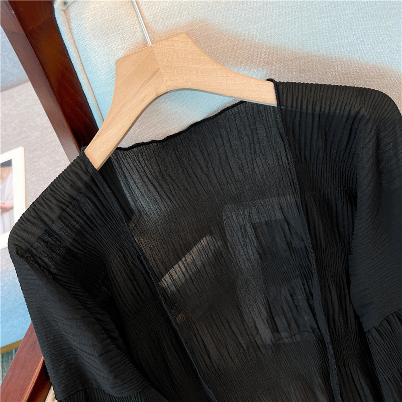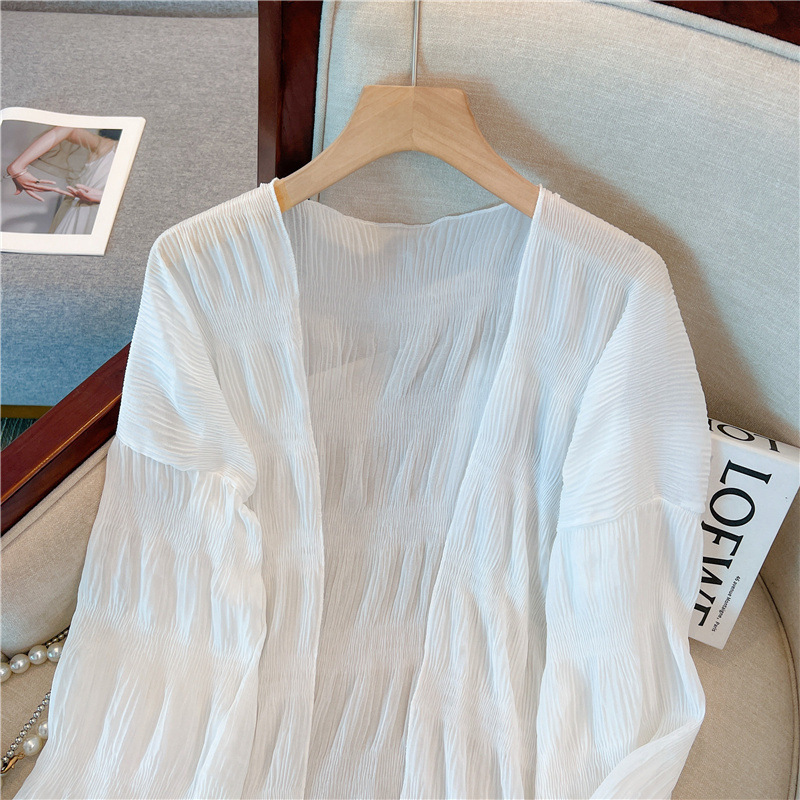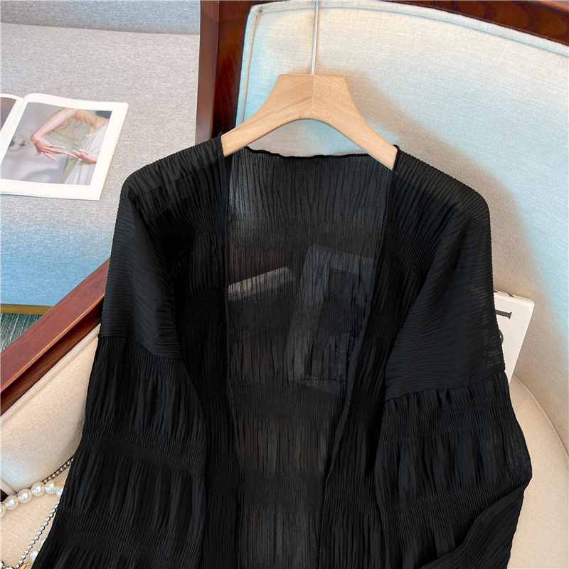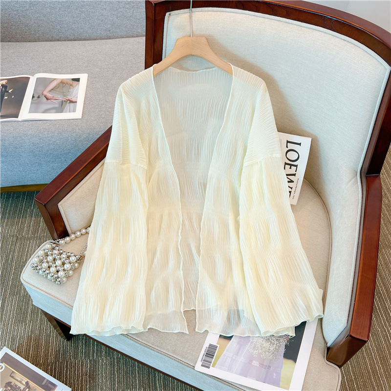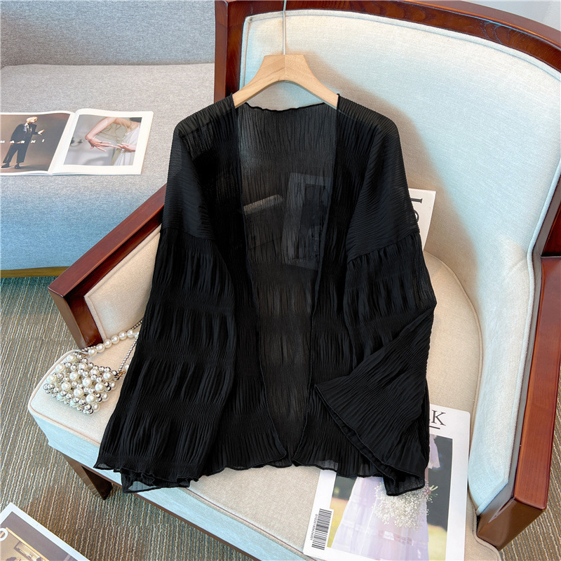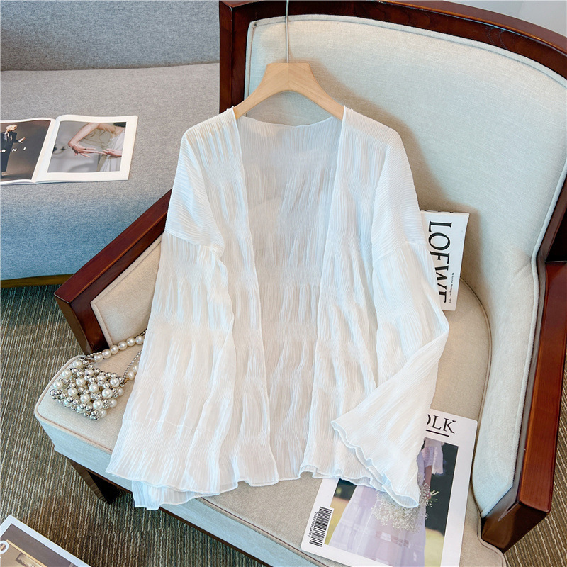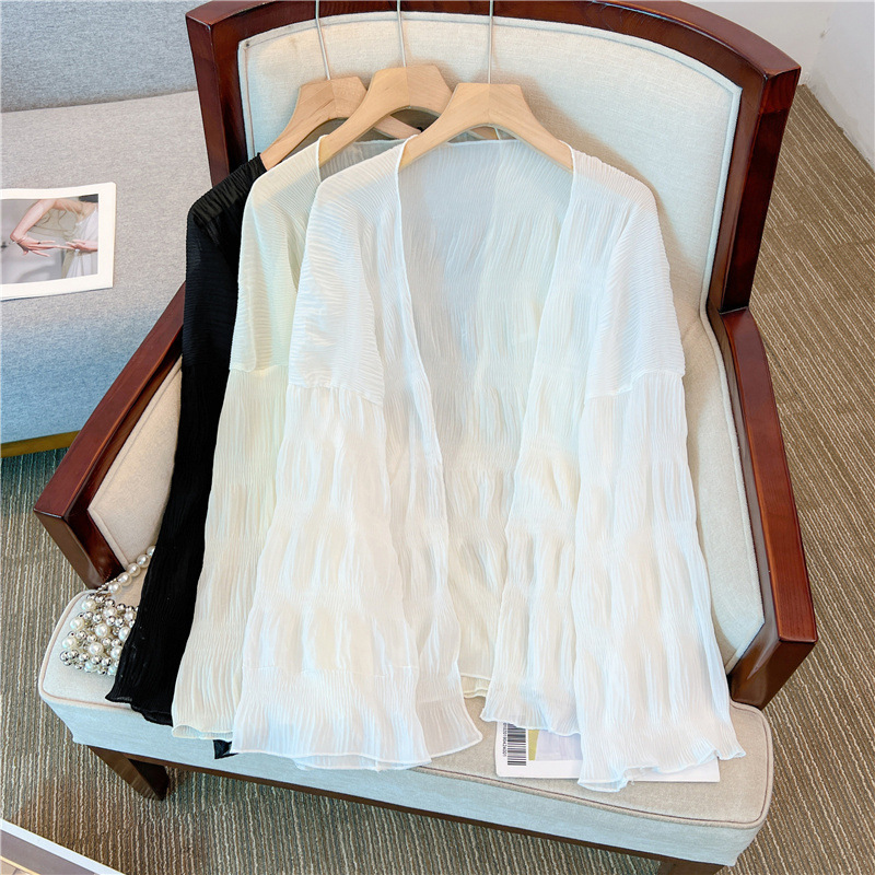 플러스 사이즈 여성의 여름 얇은 태양 보호 의류 2024 통통한 주름 디자인 카디건 자켓 풀린 다목적 탑