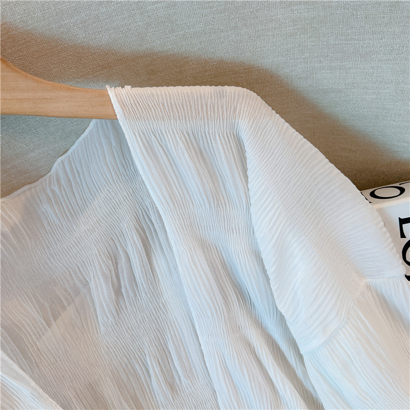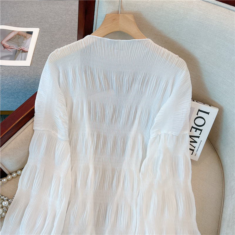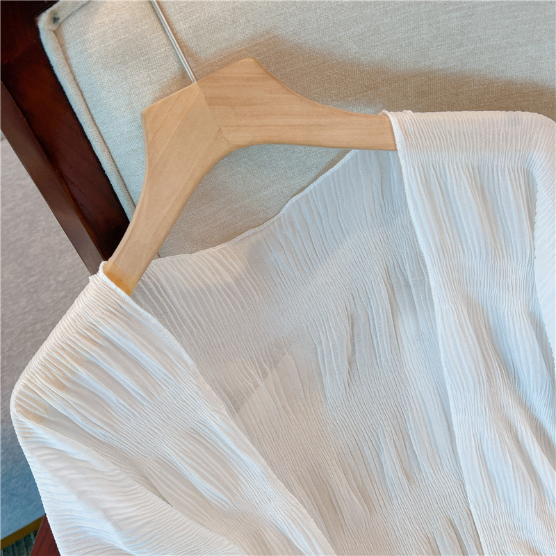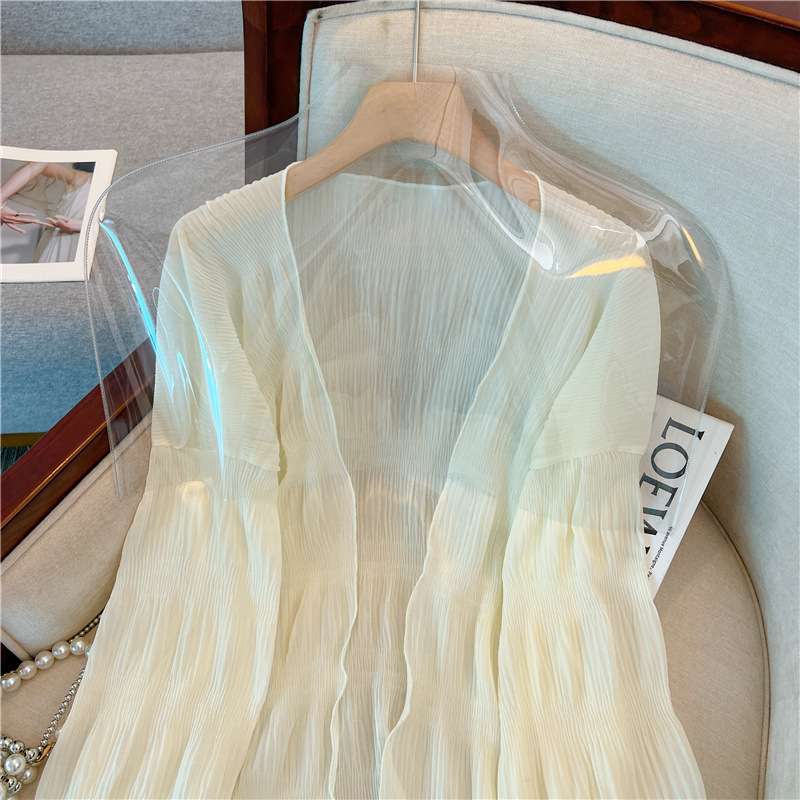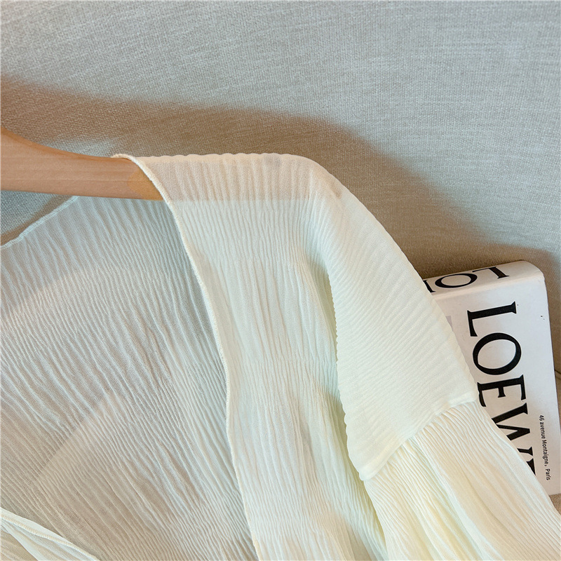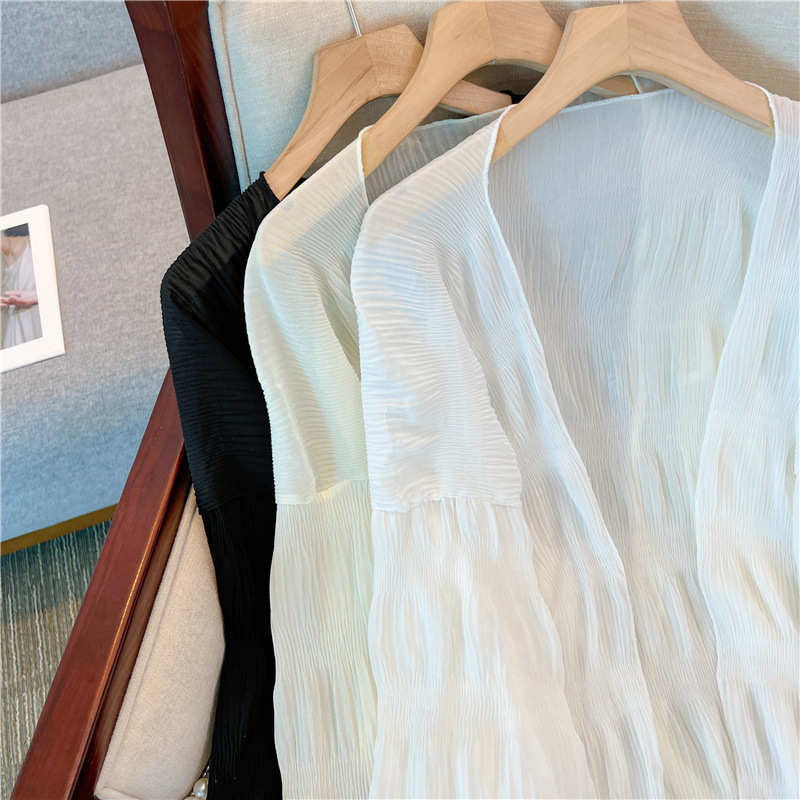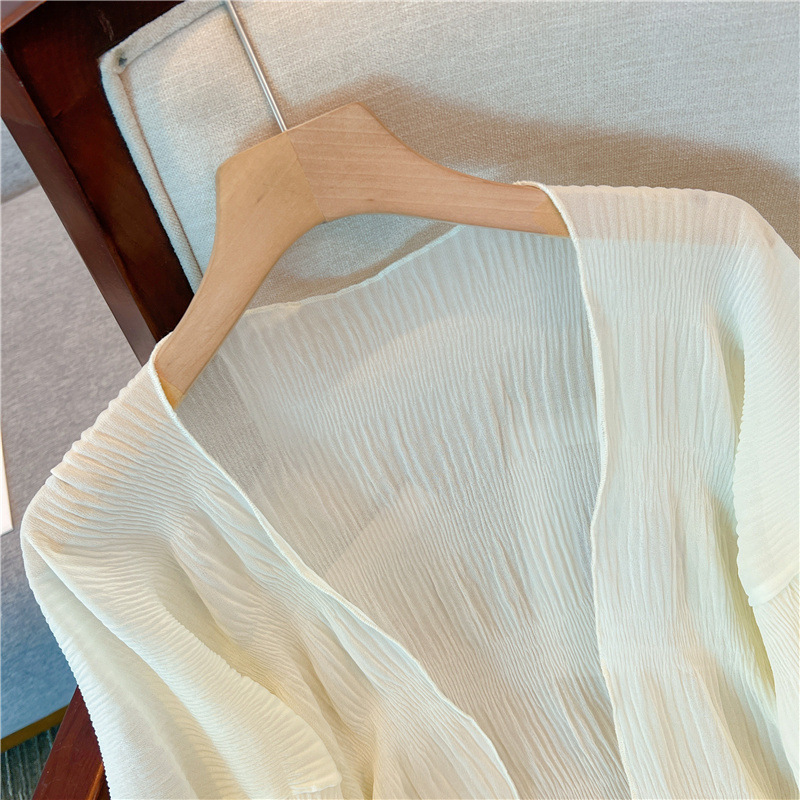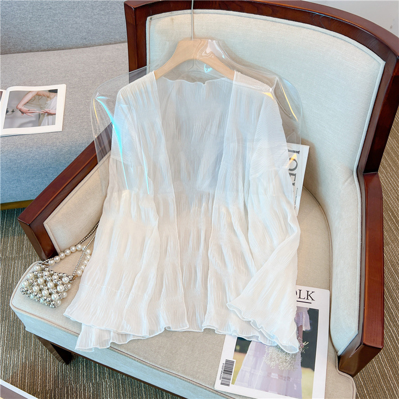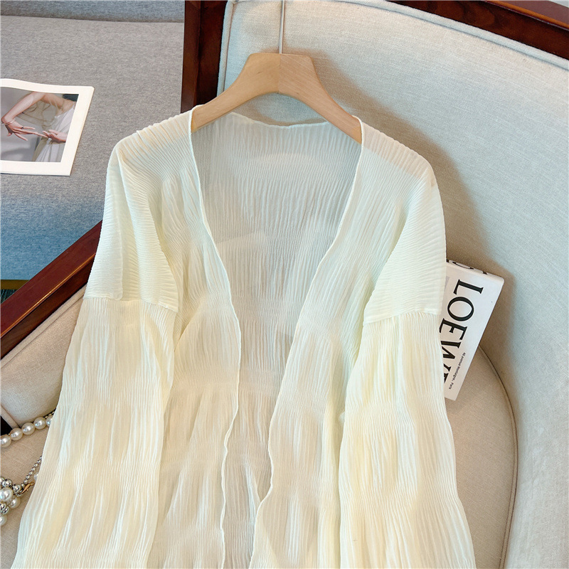 플러스 사이즈 여성의 여름 얇은 태양 보호 의류 2024 통통한 주름 디자인 카디건 자켓 풀린 다목적 탑