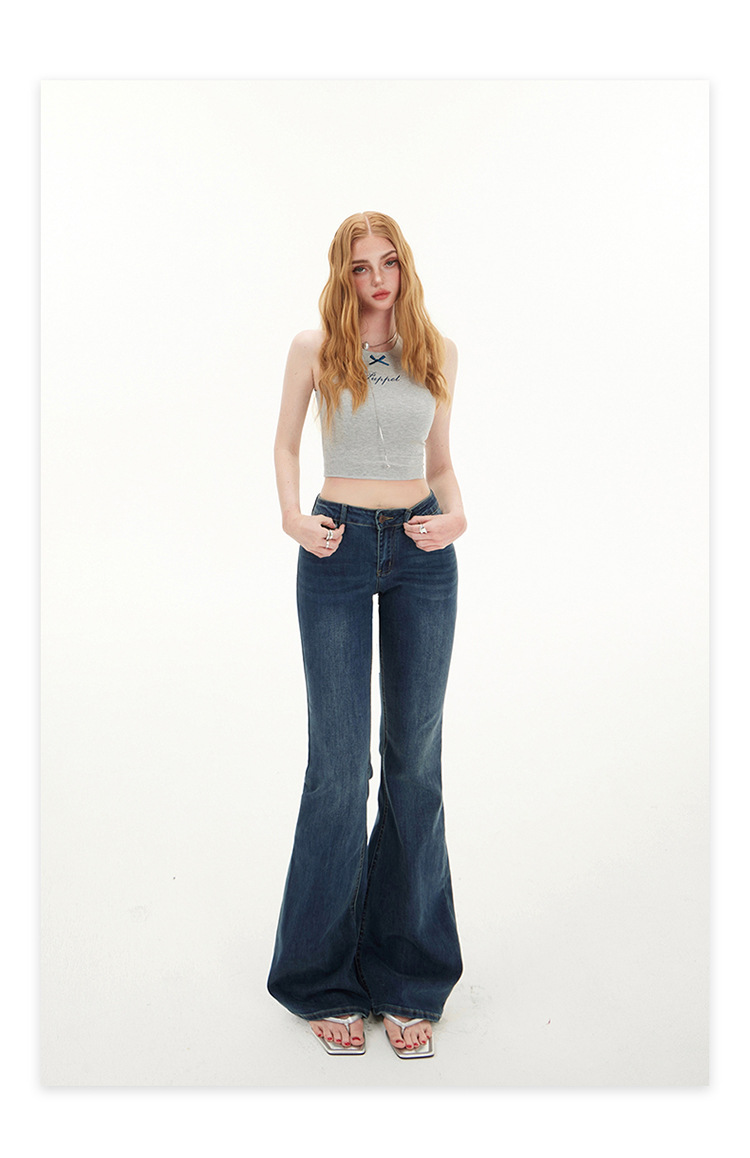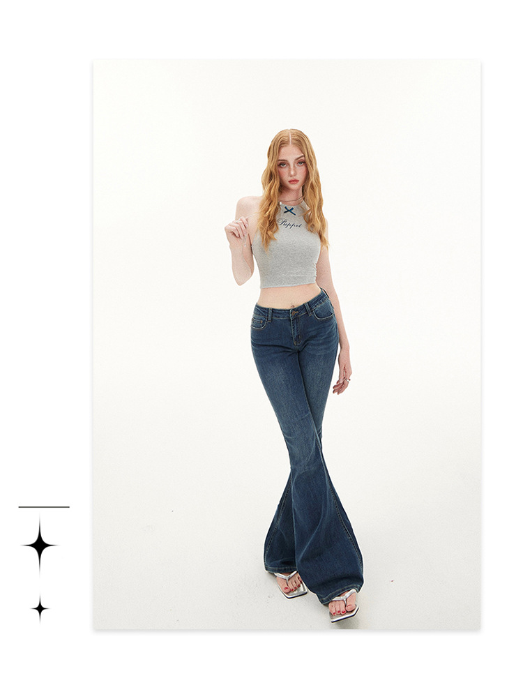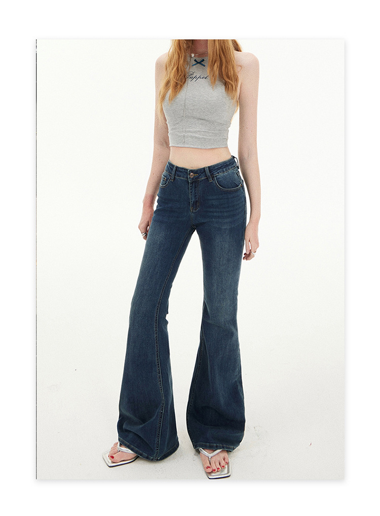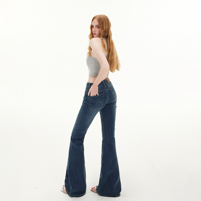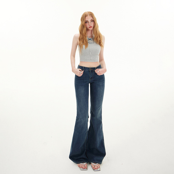 YC & 미국 스타일의 복고풍 낮은 허리 핫 소녀 플레어 팬츠 슬림 핏 슬리밍 스트레칭 청바지 여성의 봄과 여름 및 긴 바지
