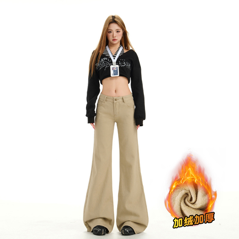 카키색 마이크로 플레어 로우 웨이스트 청바지 여성용 2025 가을 겨울 신상 벨벳 안감 레깅스 느낌 없는 아메리칸 레트로 플레어 팬츠스토어 가기
