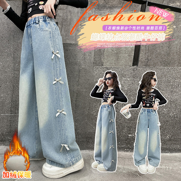여아용 데님 팬츠 가을 겨울용 두꺼운 기모 일체형 겨울용 루즈핏 여아용 와이드 팬츠 겨울용 아동 바지