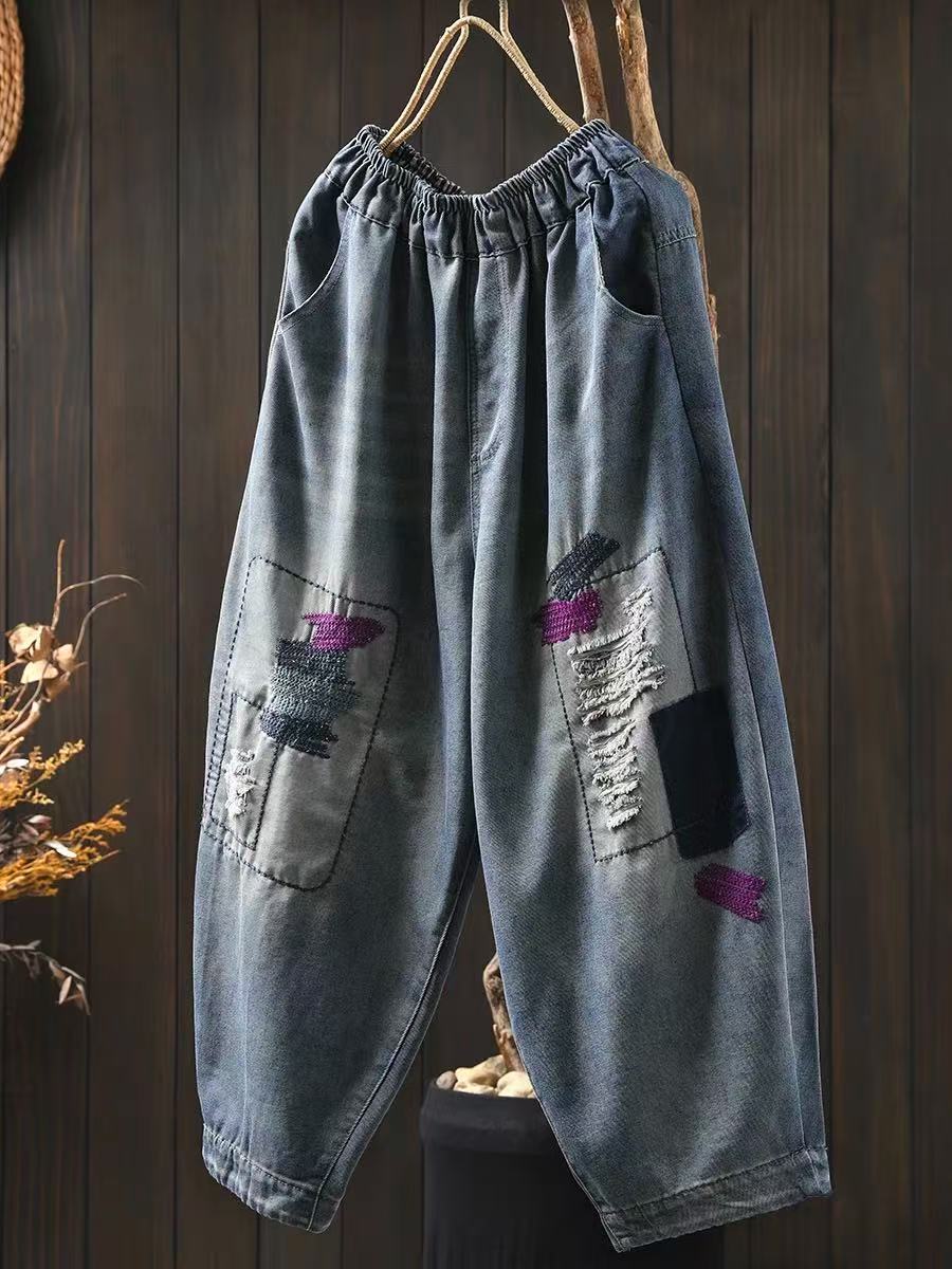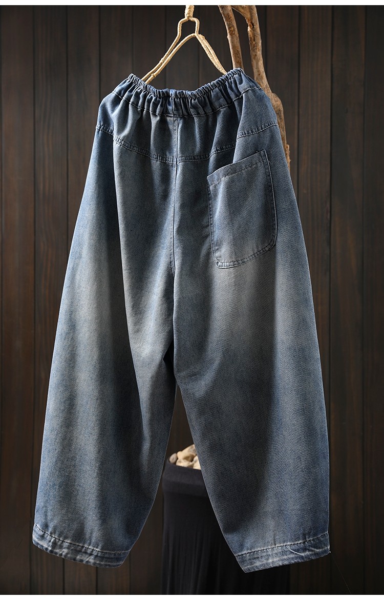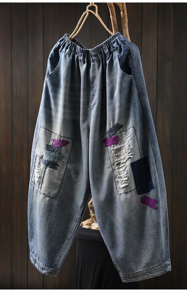 여름 얇은 명암 컬러 파우치 찢어진 마이크로 데님 할란 팬츠 여성용 느슨한 플러스 사이즈 캐주얼 자른 바지 8512스토어 가기
