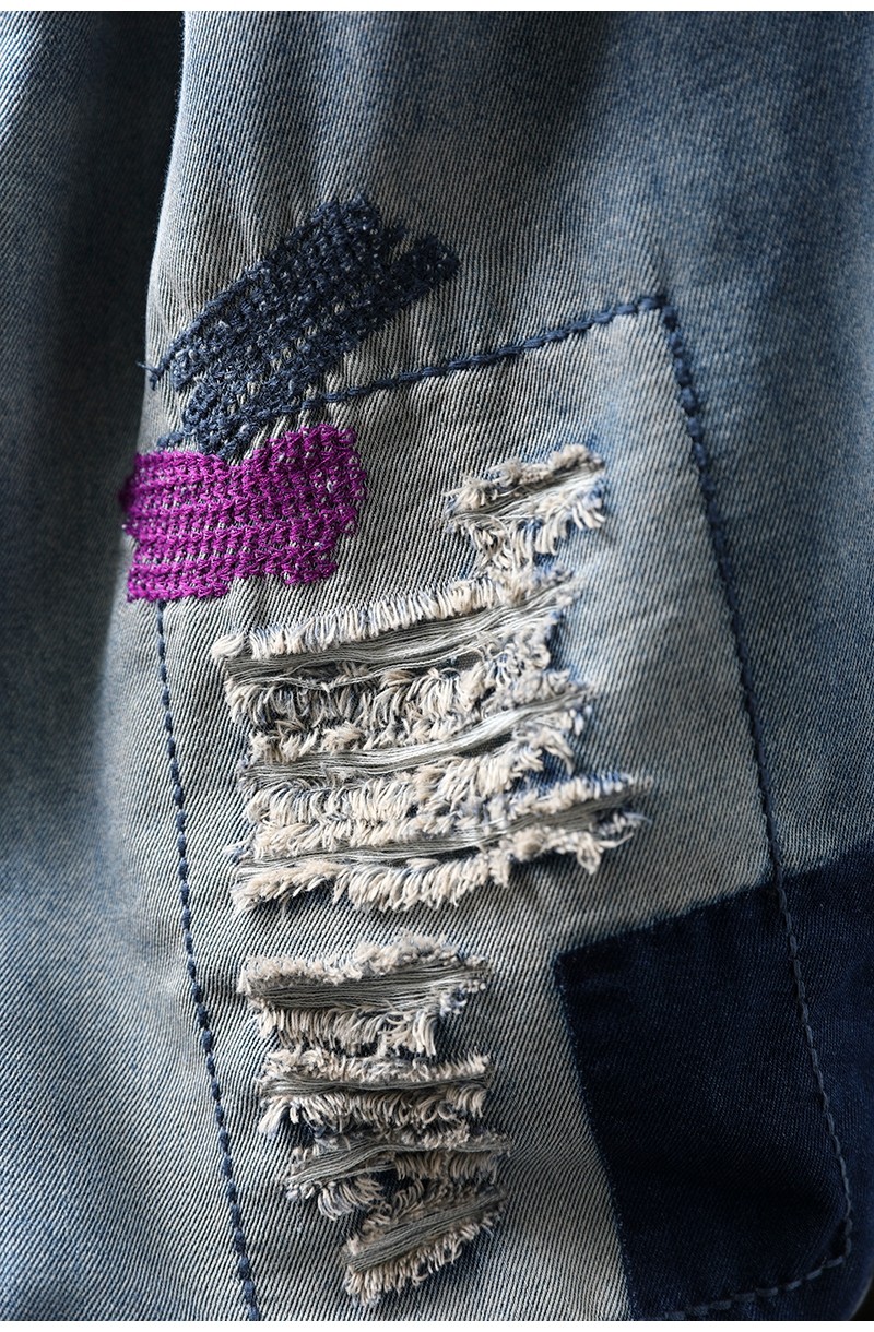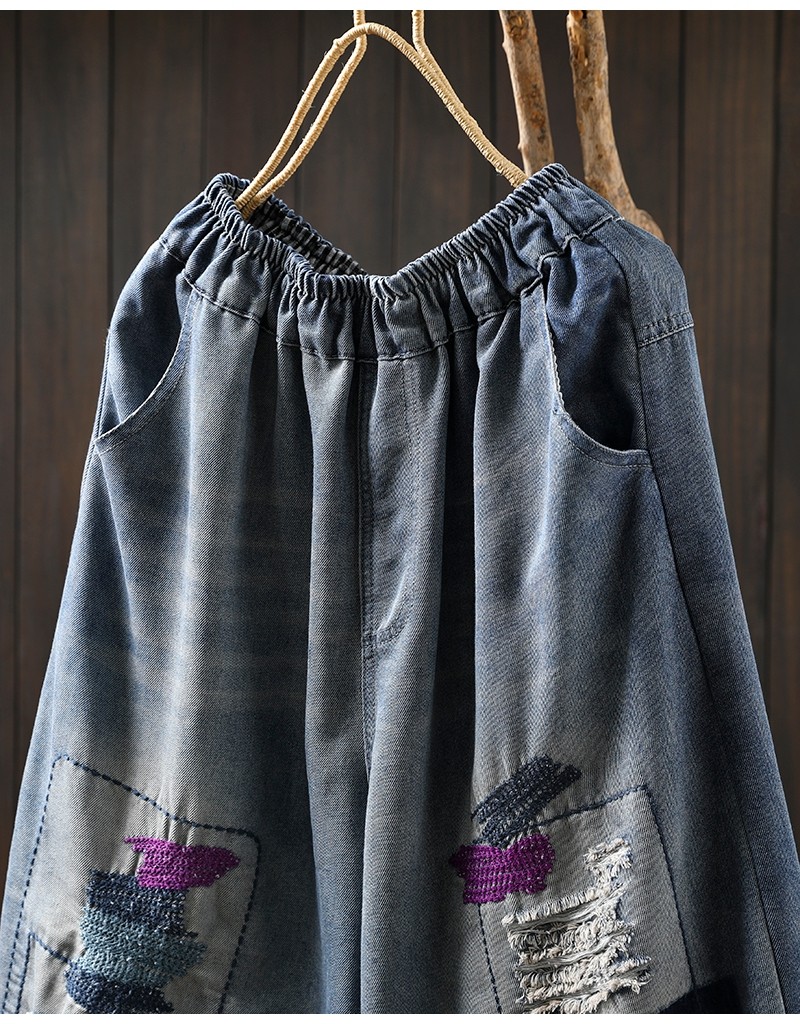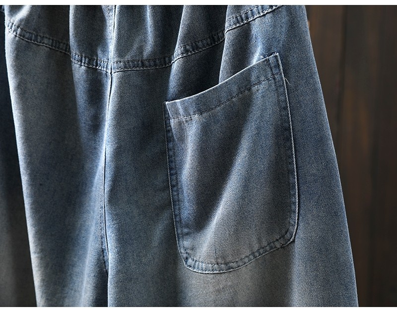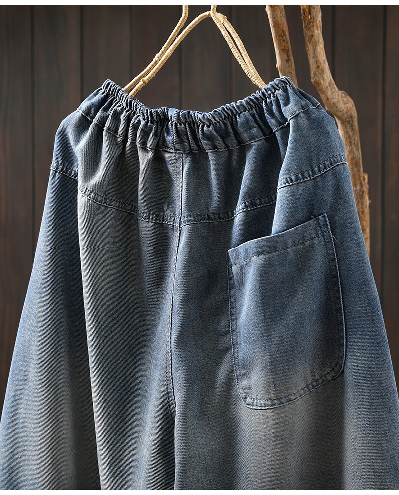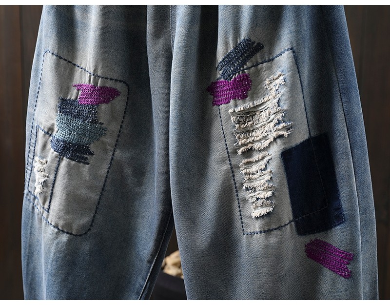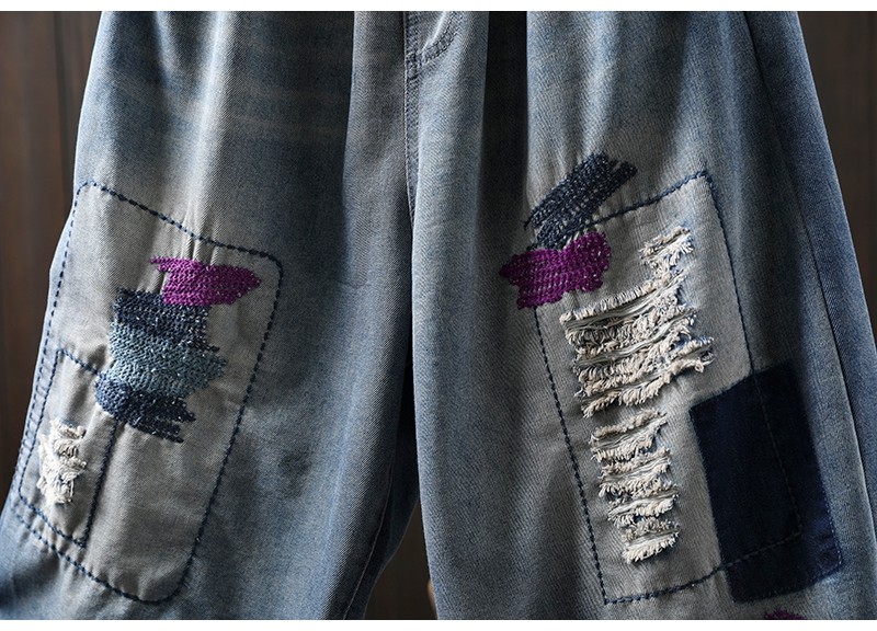 여름 얇은 명암 컬러 파우치 찢어진 마이크로 데님 할란 팬츠 여성용 느슨한 플러스 사이즈 캐주얼 자른 바지 8512