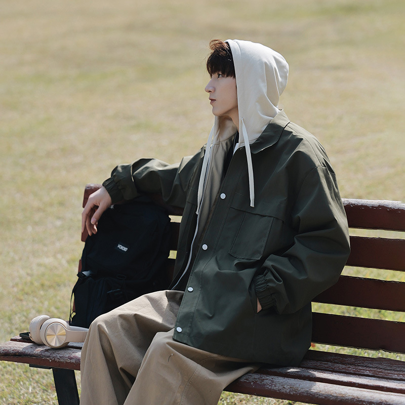 코트 남자 봄과 가을 소년의 2024 새로운 가짜 2 피스 재킷 십대 남자 후드 탑 없음