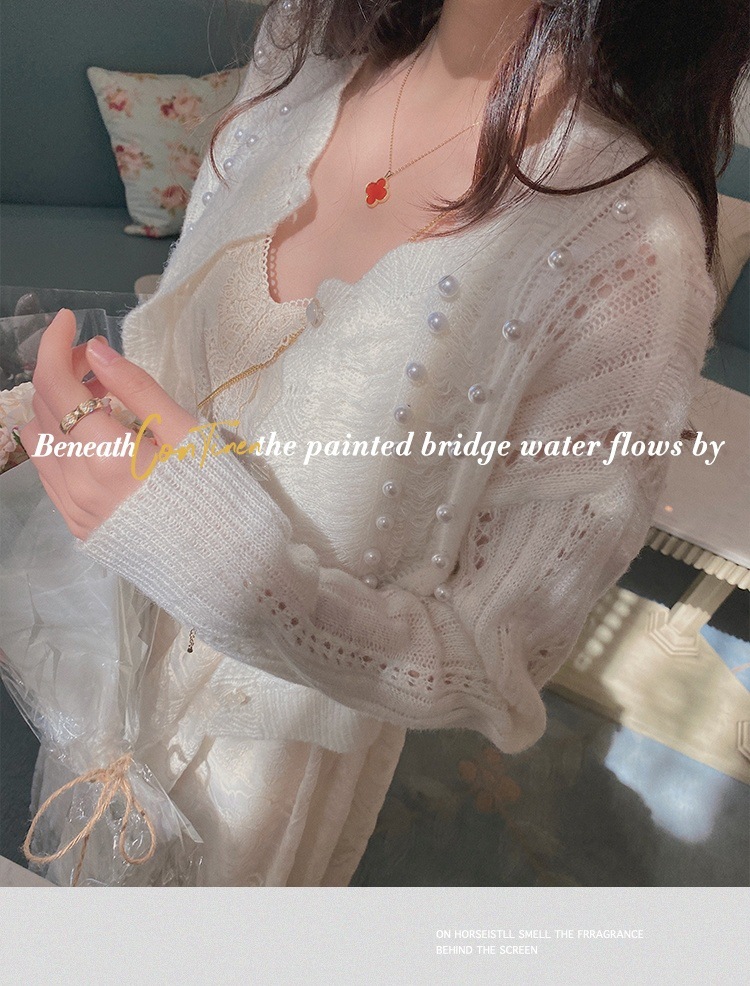 Nuomijia 화이트 니트 카디건 얇은 여성의 여름 중장비 비드 할로우 아웃 디자인 슬링 스커트 오버 셔츠
