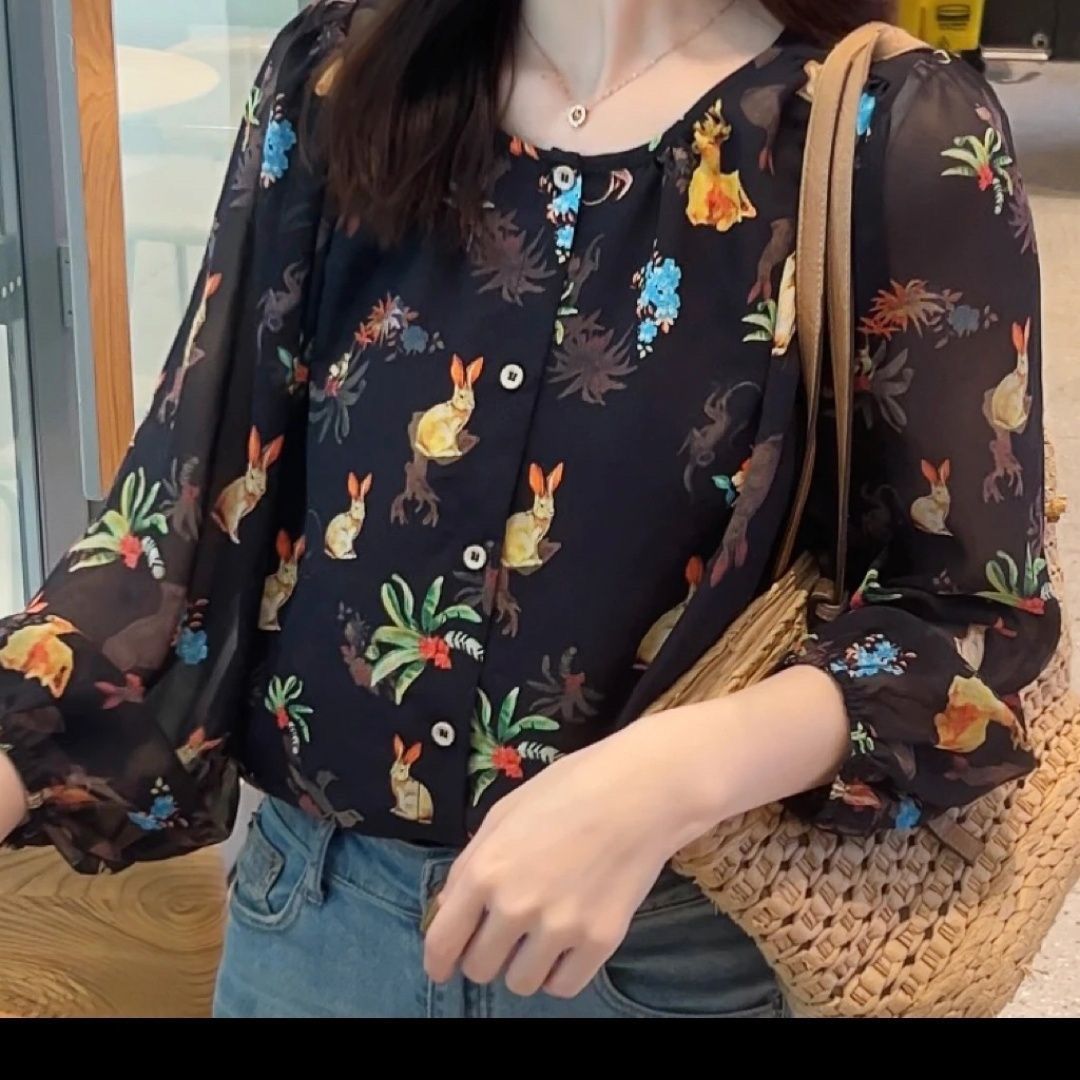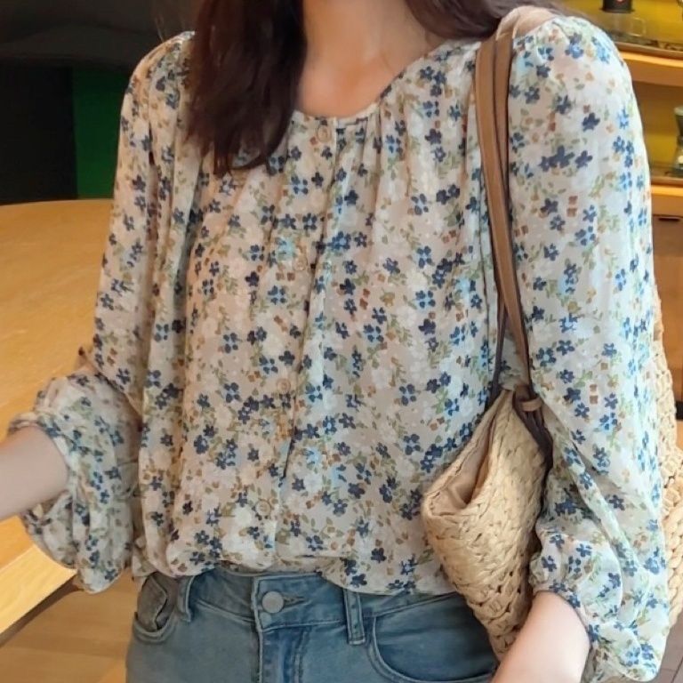 프랑스 스타일 라이트 성숙한 스타일 버블 슬리브 꽃 긴 소매 셔츠 봄과 가을 우아한 달콤한 모든 경기 슬리밍 라운드 넥 탑 트렌디스토어 가기