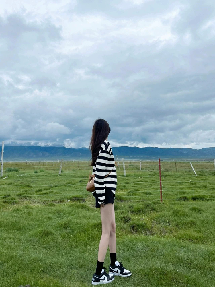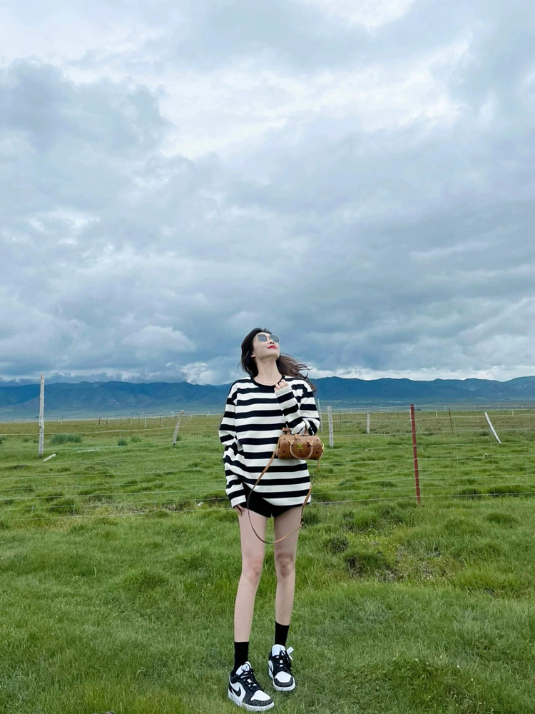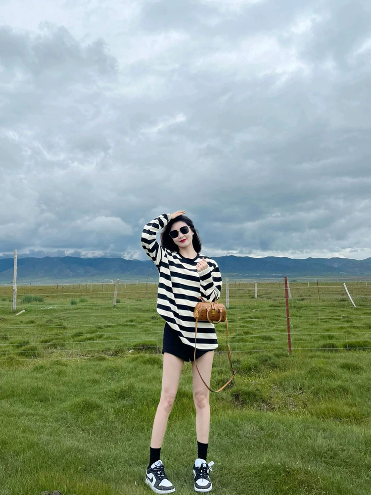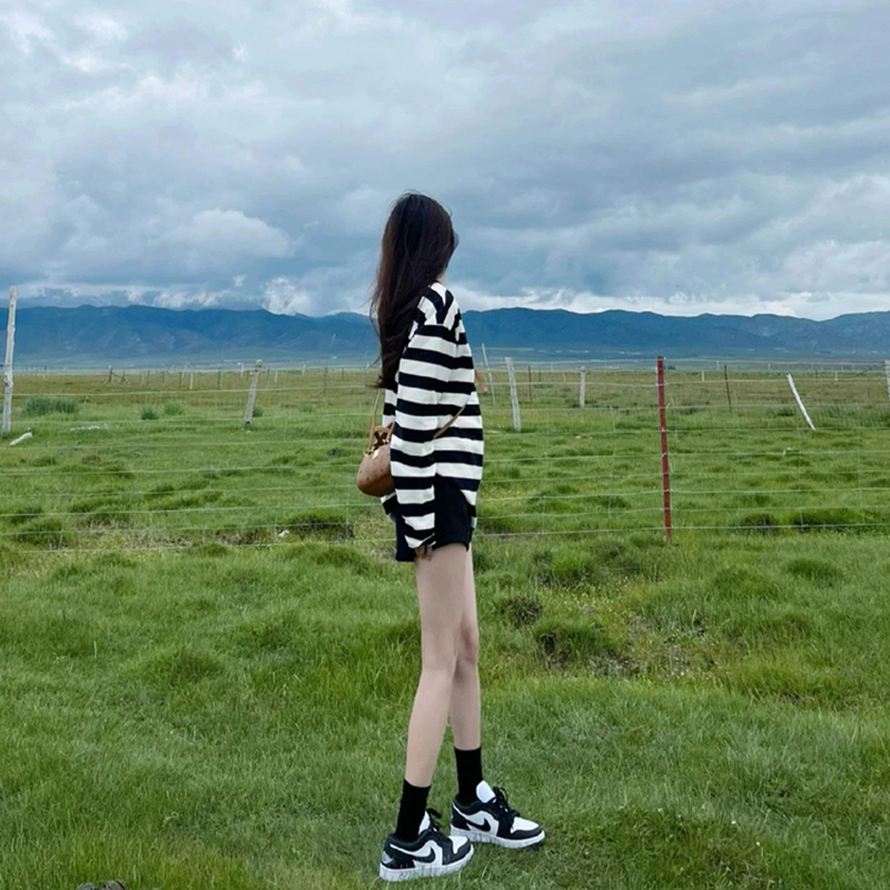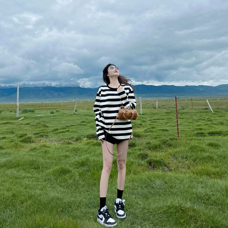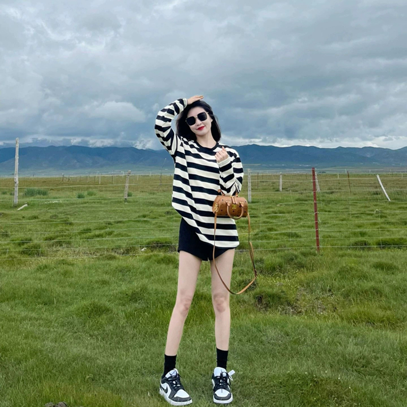 면 긴팔 줄무늬 티셔츠 여자 느슨한 중장탑 2025 봄 · 가을 새 한국식 올매치베이스 셔츠