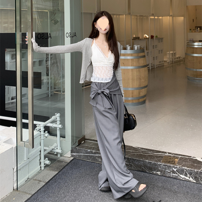 세트 여성의 가을 새로운 순수한 욕망 스타일 레이스 카미솔 긴팔 니트 카디건 높은 허리 와이드 레그 바지 3 피스 세트스토어 가기