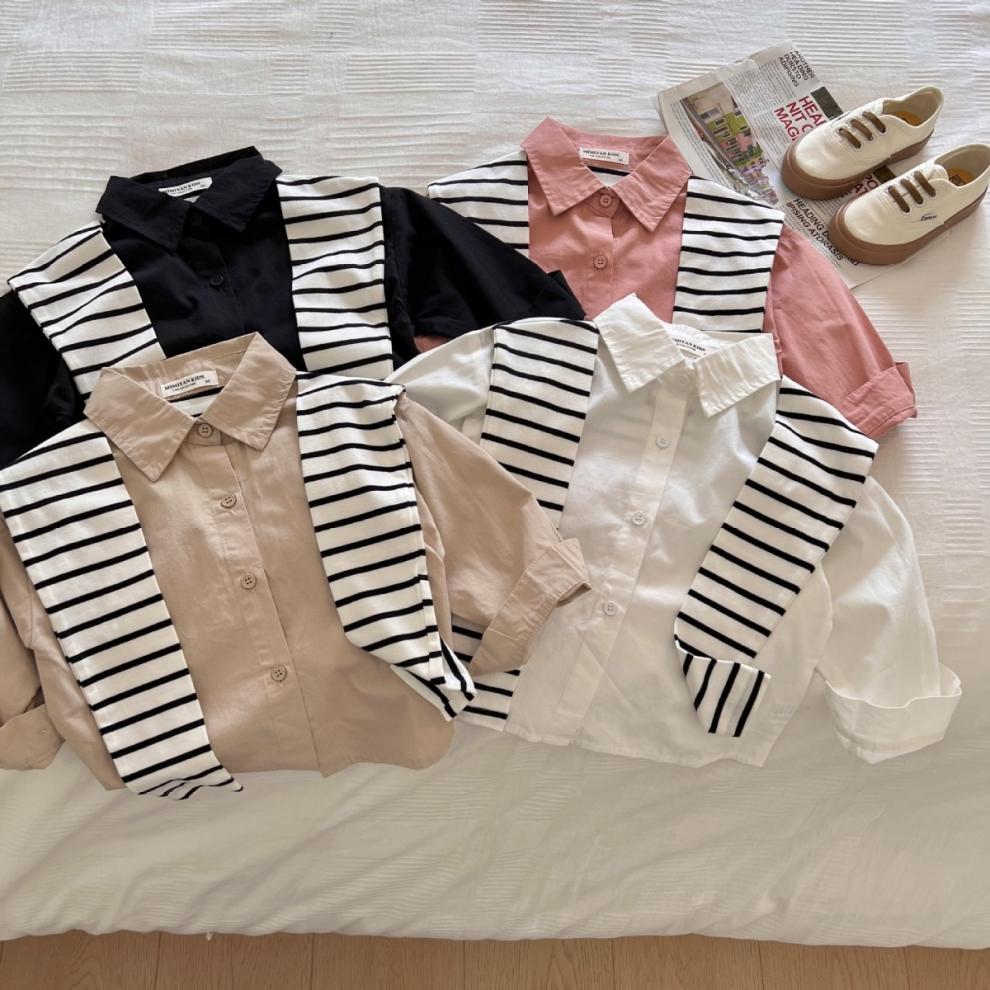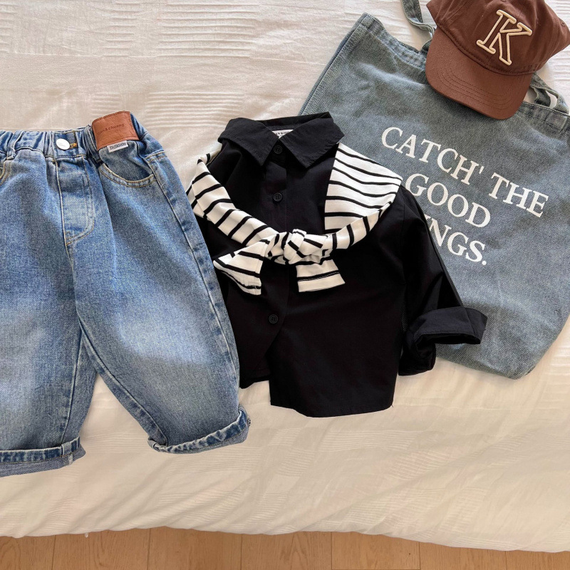 [2025 새 어린이 봄 의류] 아동복 어린이 셔츠 가을 새 가짜 투피스 단색 목도리 소년 소녀