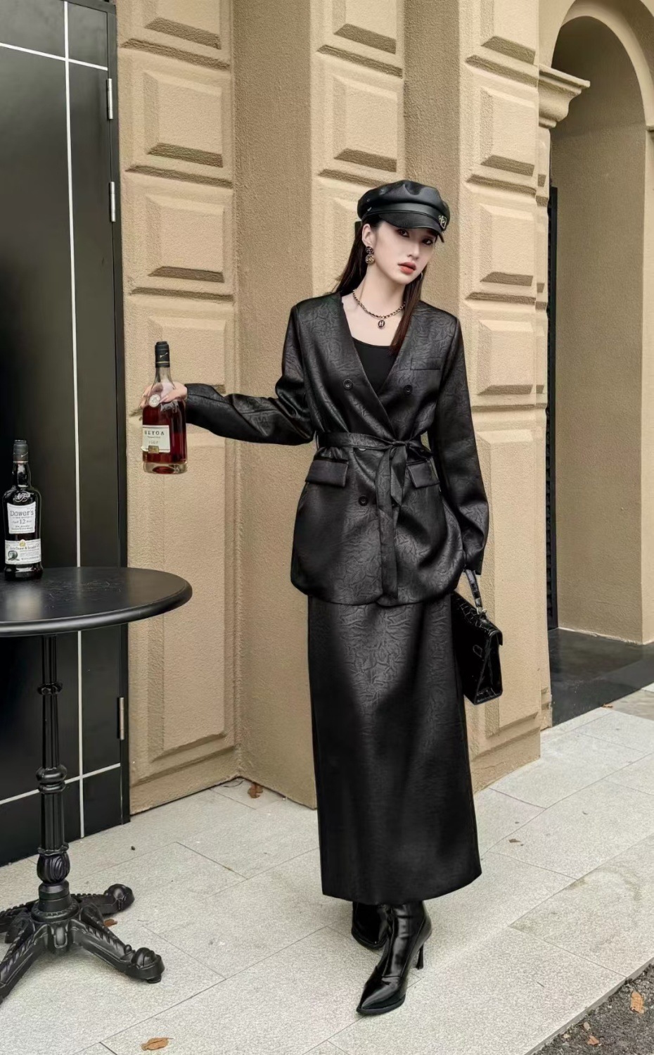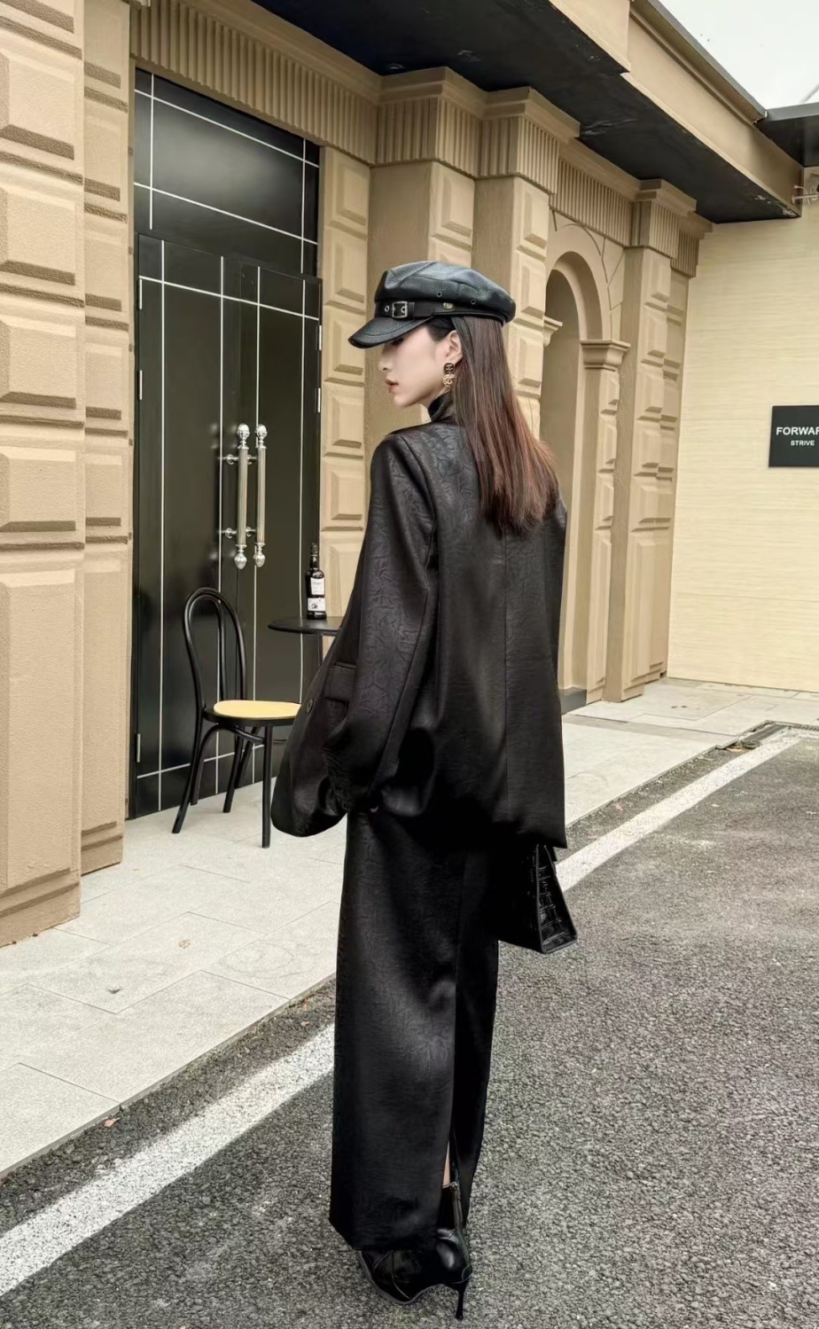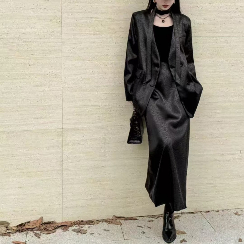고급 다크 패턴 재킷 스커트 세트 여성 2025 봄 새로운 느슨한 우아한 새틴 레이스 투피스 세트
