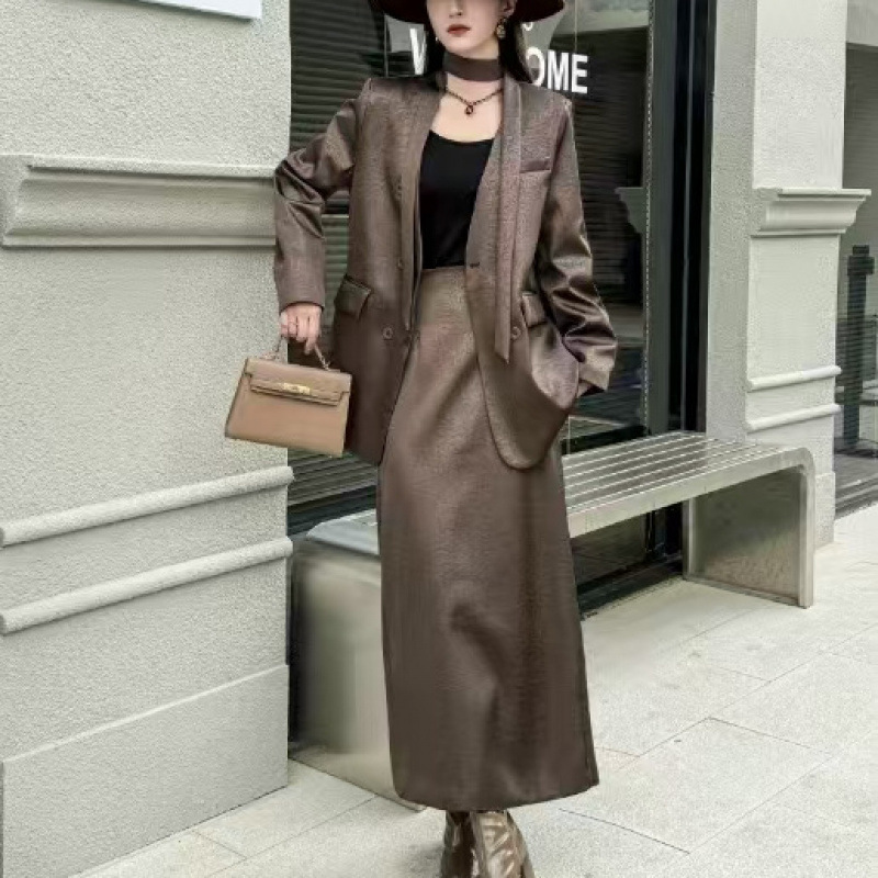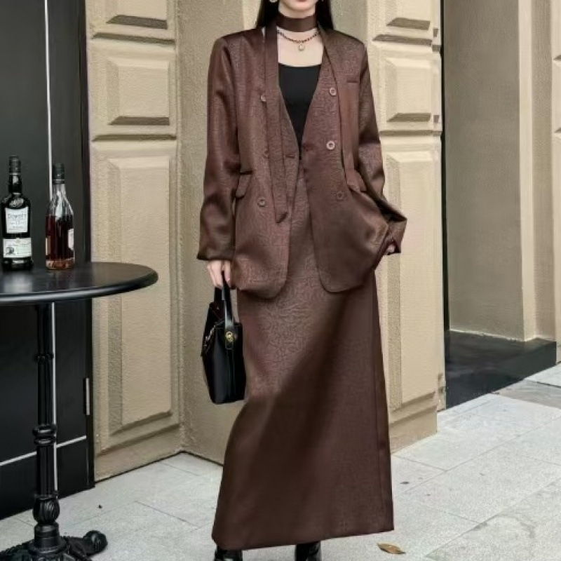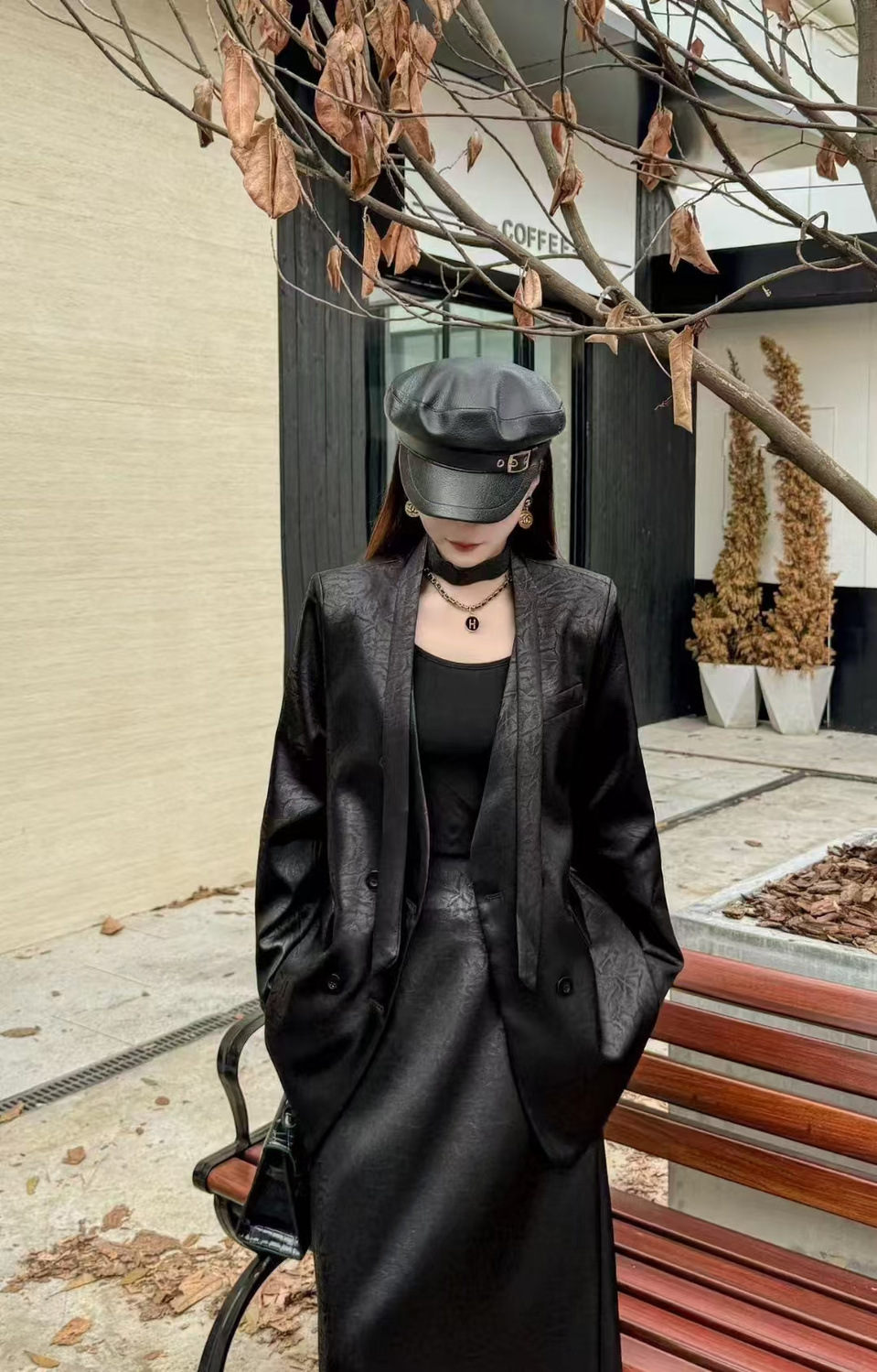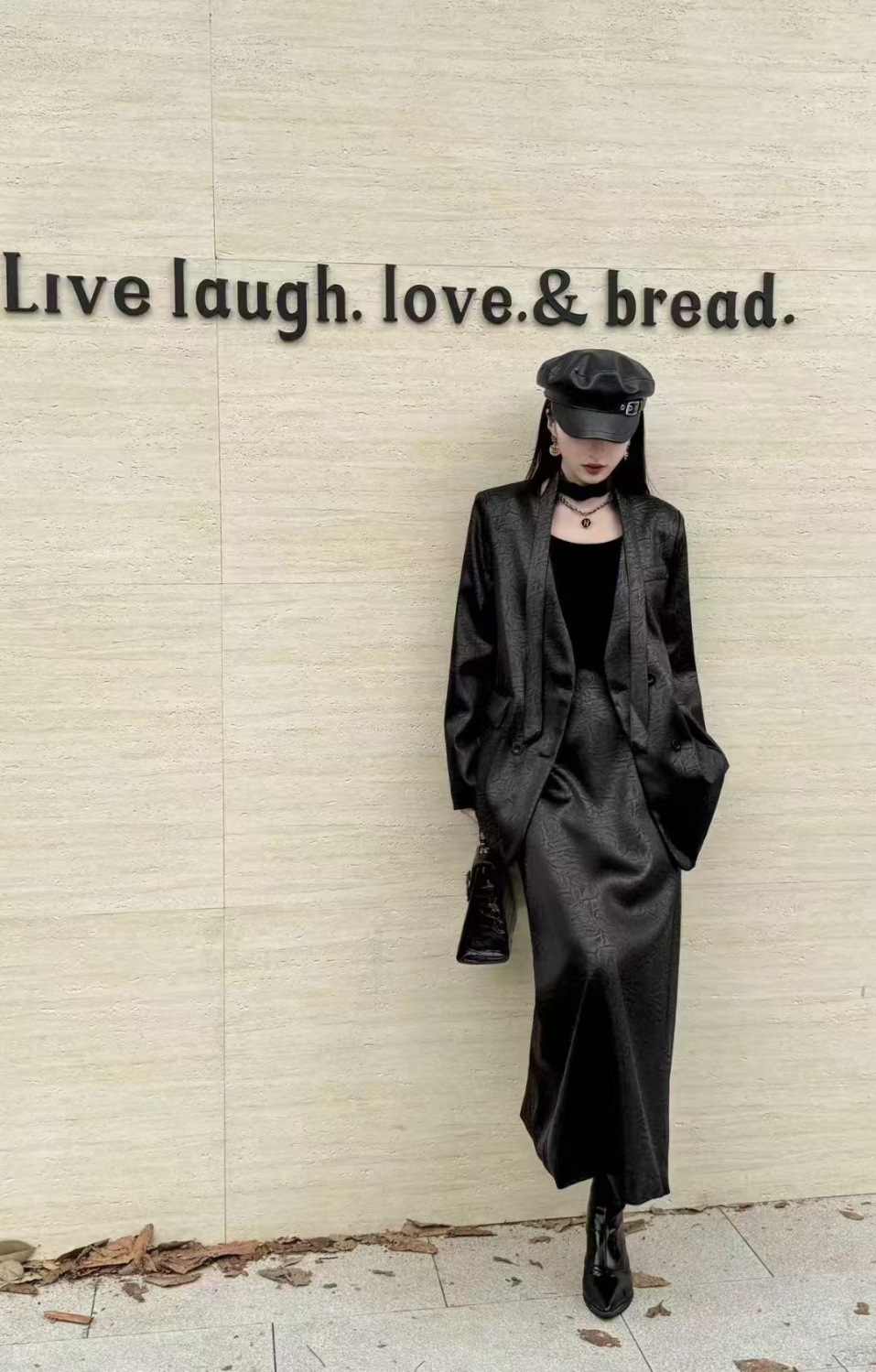 고급 다크 패턴 재킷 스커트 세트 여성 2025 봄 새로운 느슨한 우아한 새틴 레이스 투피스 세트