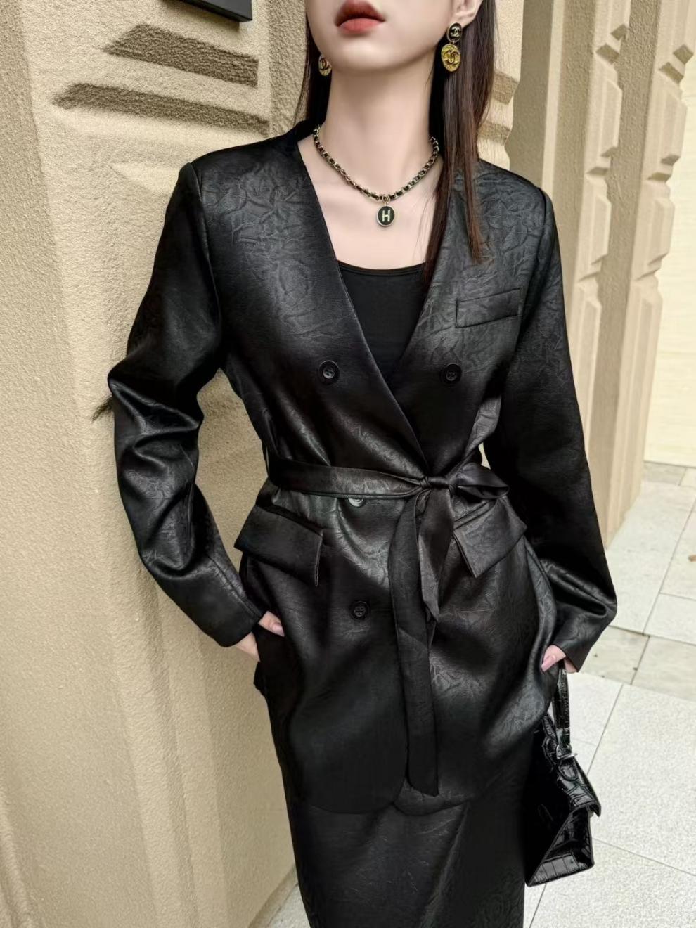고급 다크 패턴 재킷 스커트 세트 여성 2025 봄 새로운 느슨한 우아한 새틴 레이스 투피스 세트스토어 가기