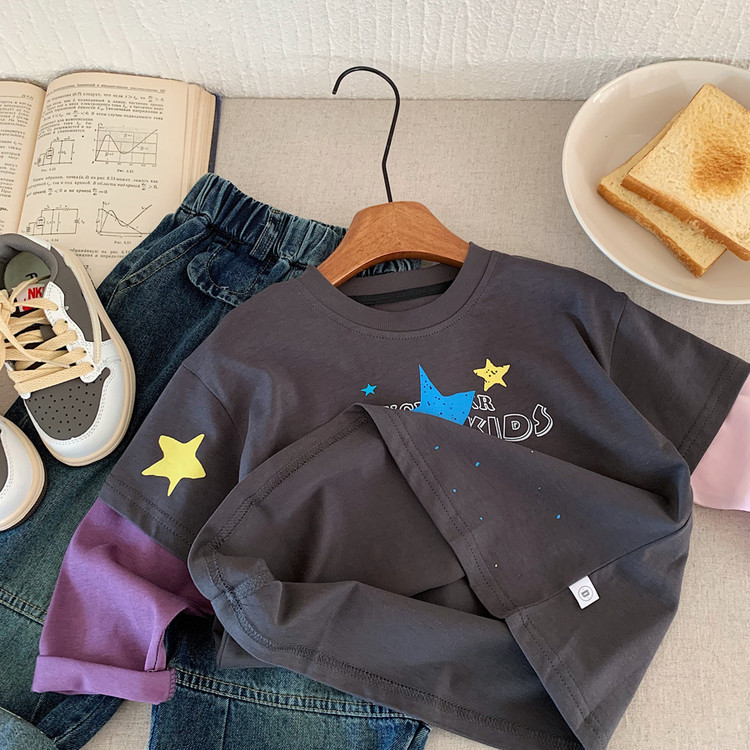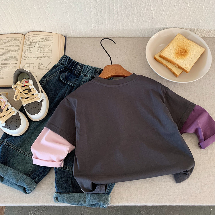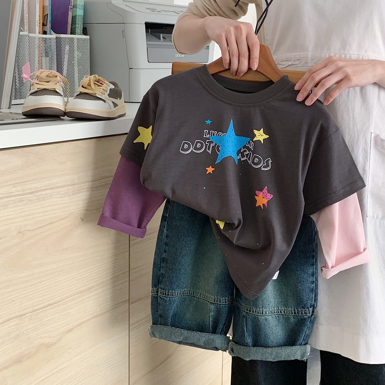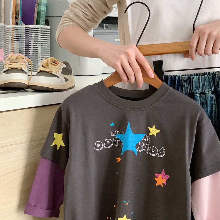 소년 긴팔 티셔츠 2025 부가당 가을 신작 어린이 가짜 투피스 대비 색상 캐주얼 루즈 바닥 셔츠 트렌디 t스토어 가기