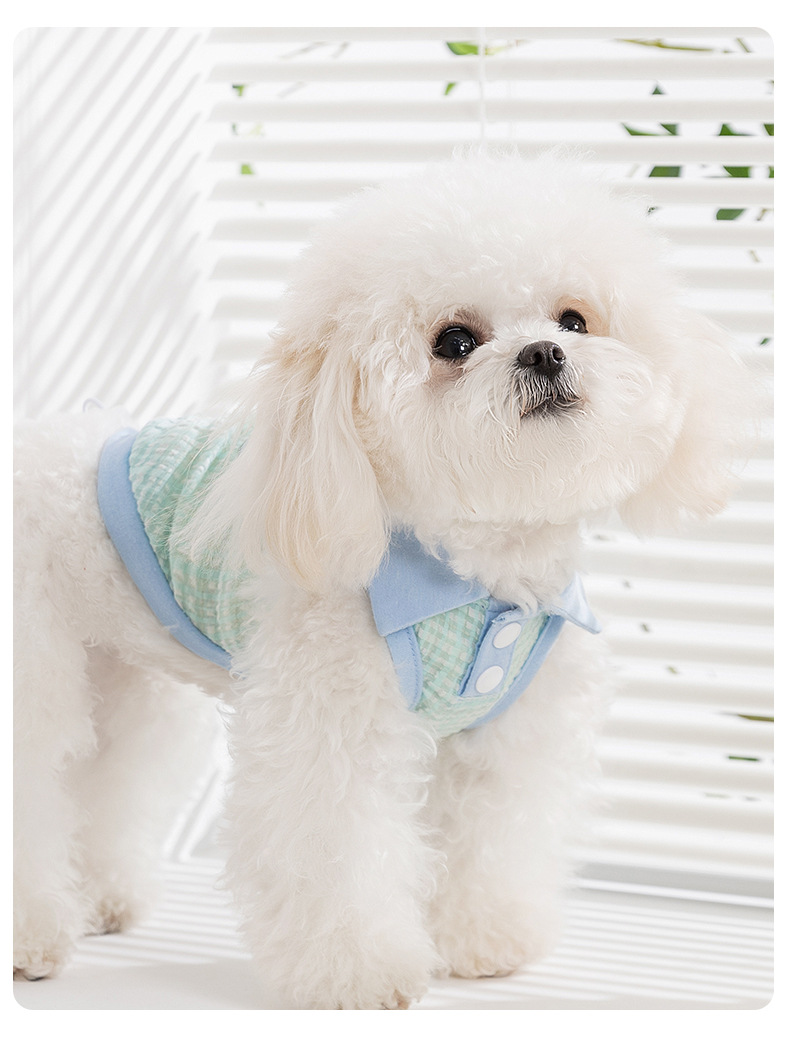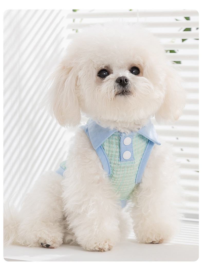 봄과 여름 개 자카드 격자 무늬 옷깃 끈이 두 다리 조끼 작은 개 테디 고양이 티셔츠 애완 동물 옷스토어 가기