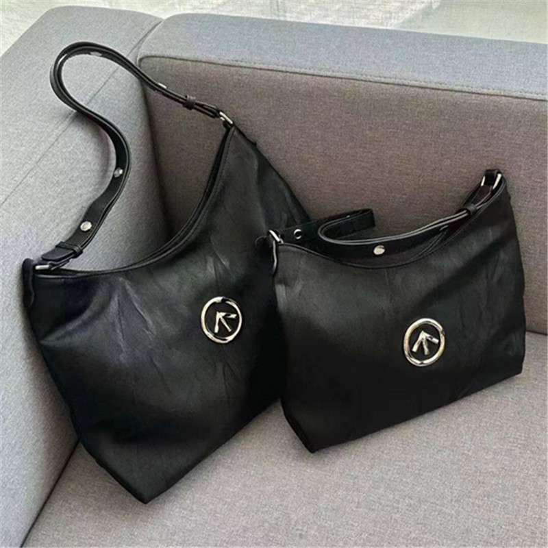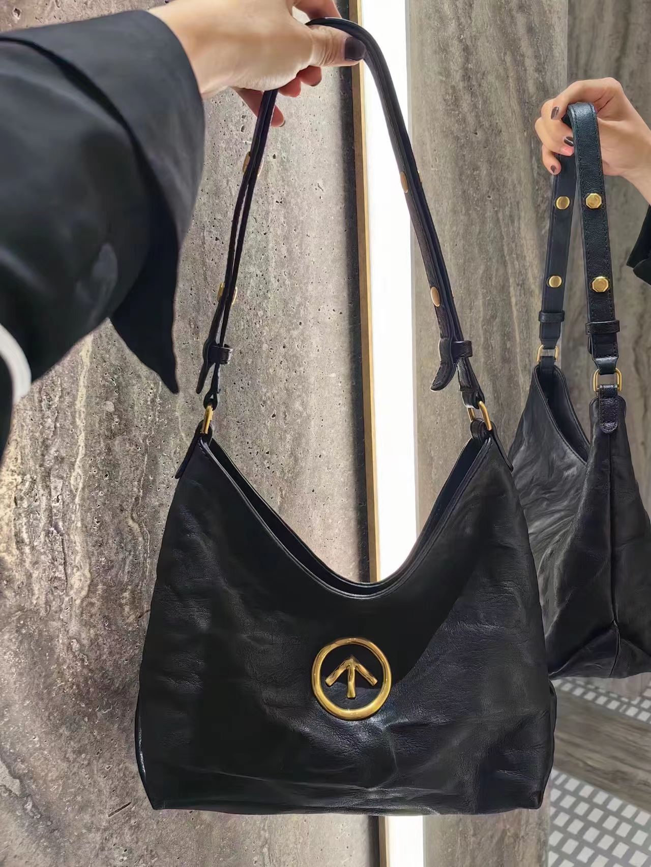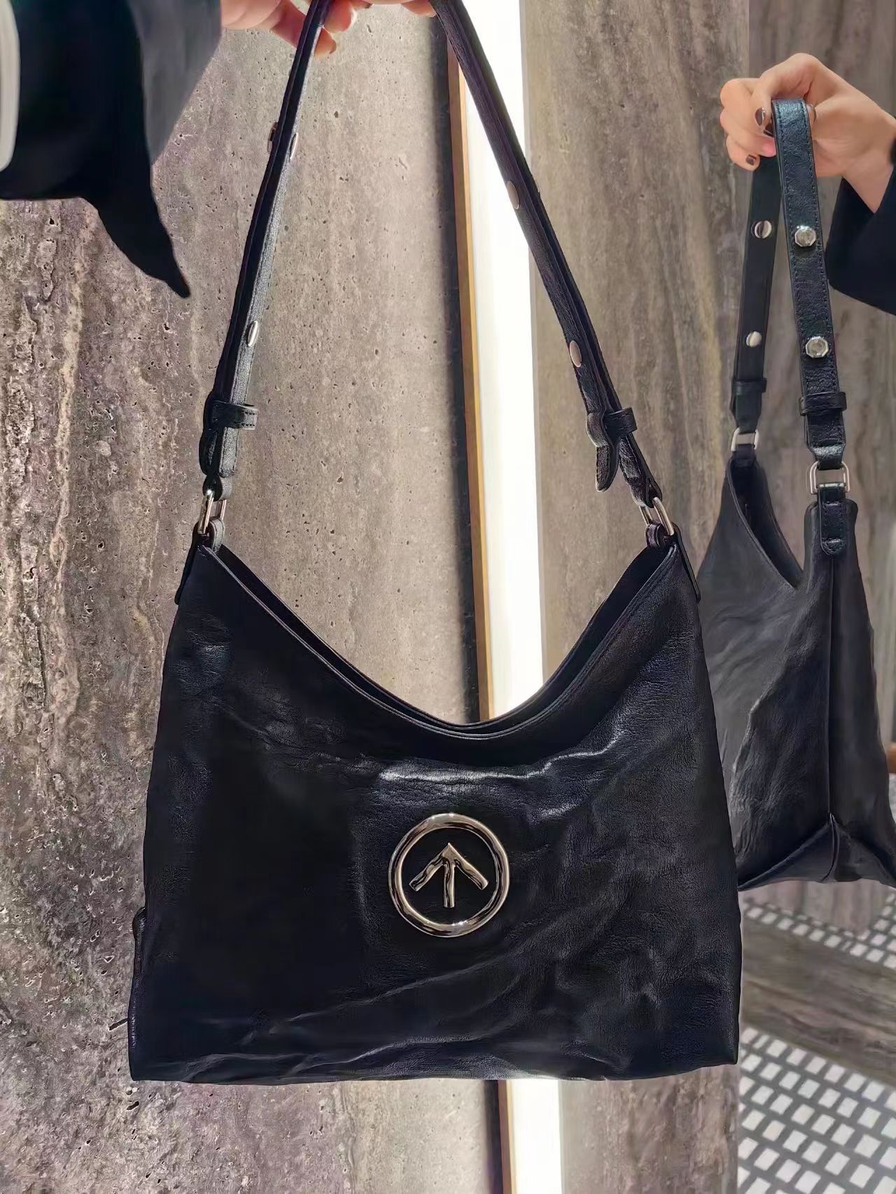 GROTTO 섹스리스 블랙 스톤 호보 가방 주름 손 어깨 크로스 바디 겨드랑이 부드러운 가죽 화살표 가방