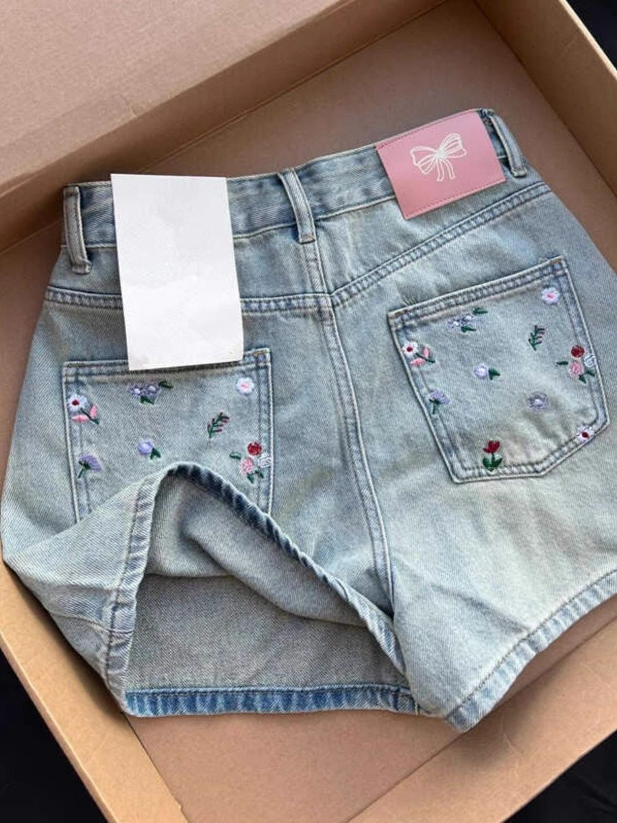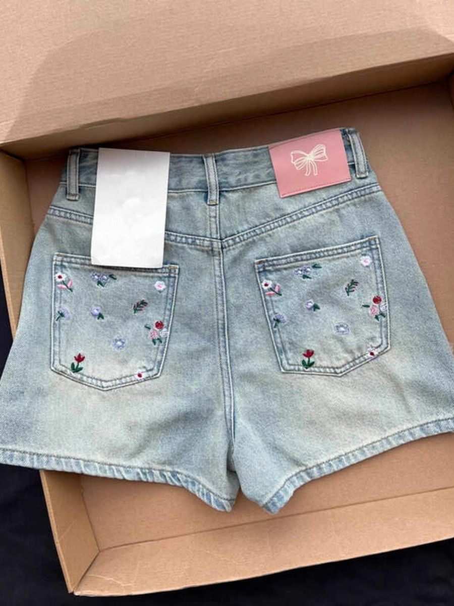 정말 포효, 봐! 자수 꽃 데님 반바지 여성 여름 높은 허리 슬리밍 A-라인 넓은 다리 핫 트렌디 한 Ins 바지