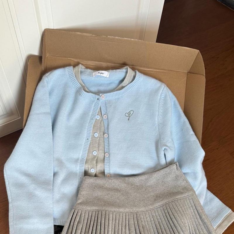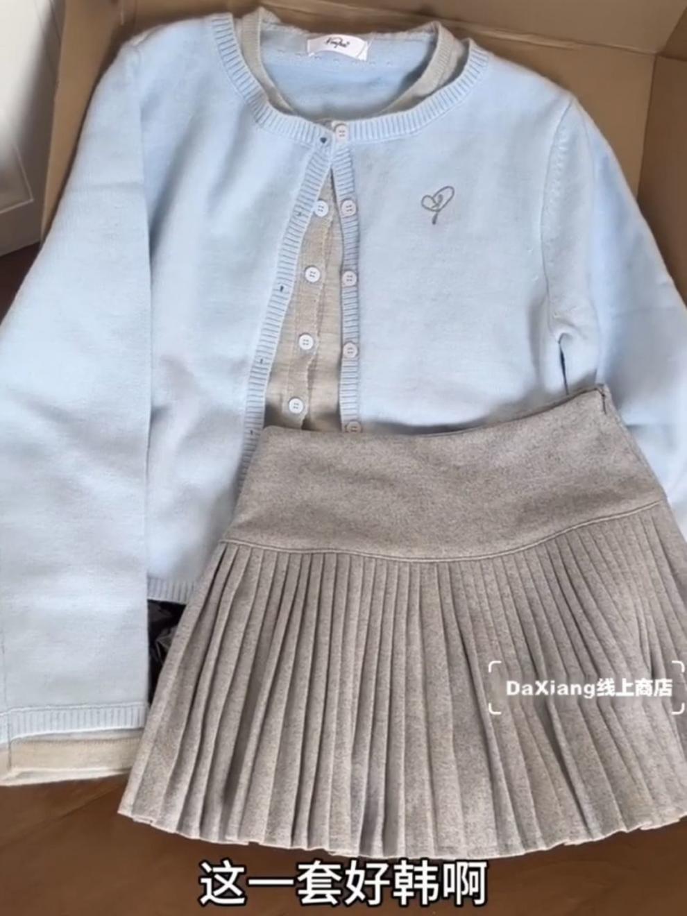 • 블루 & 그레이 스웨터 + 그레이 플리츠 스커트 [투피스 세트]