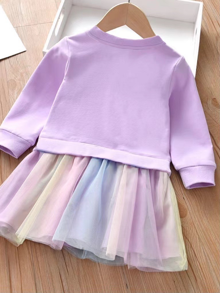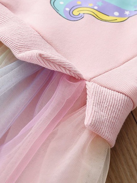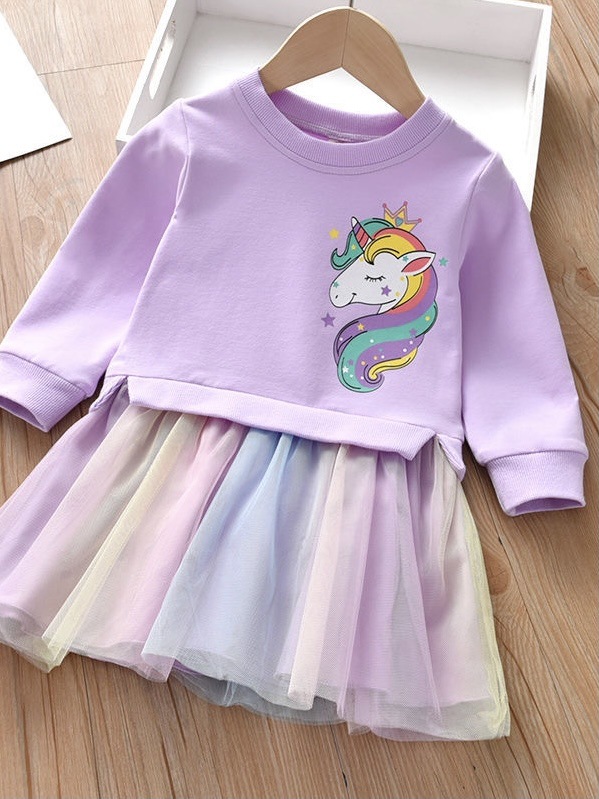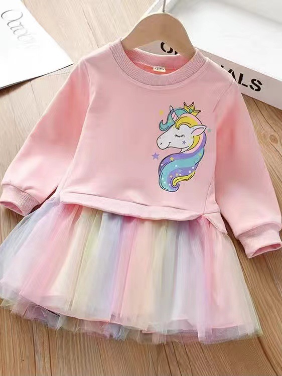소녀의 스웨터 원피스 봄과 가을 아기의 베일 원피스 소녀의 공주 원피스 유니콘 메쉬 바느질 원피스