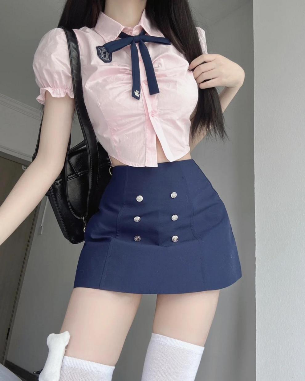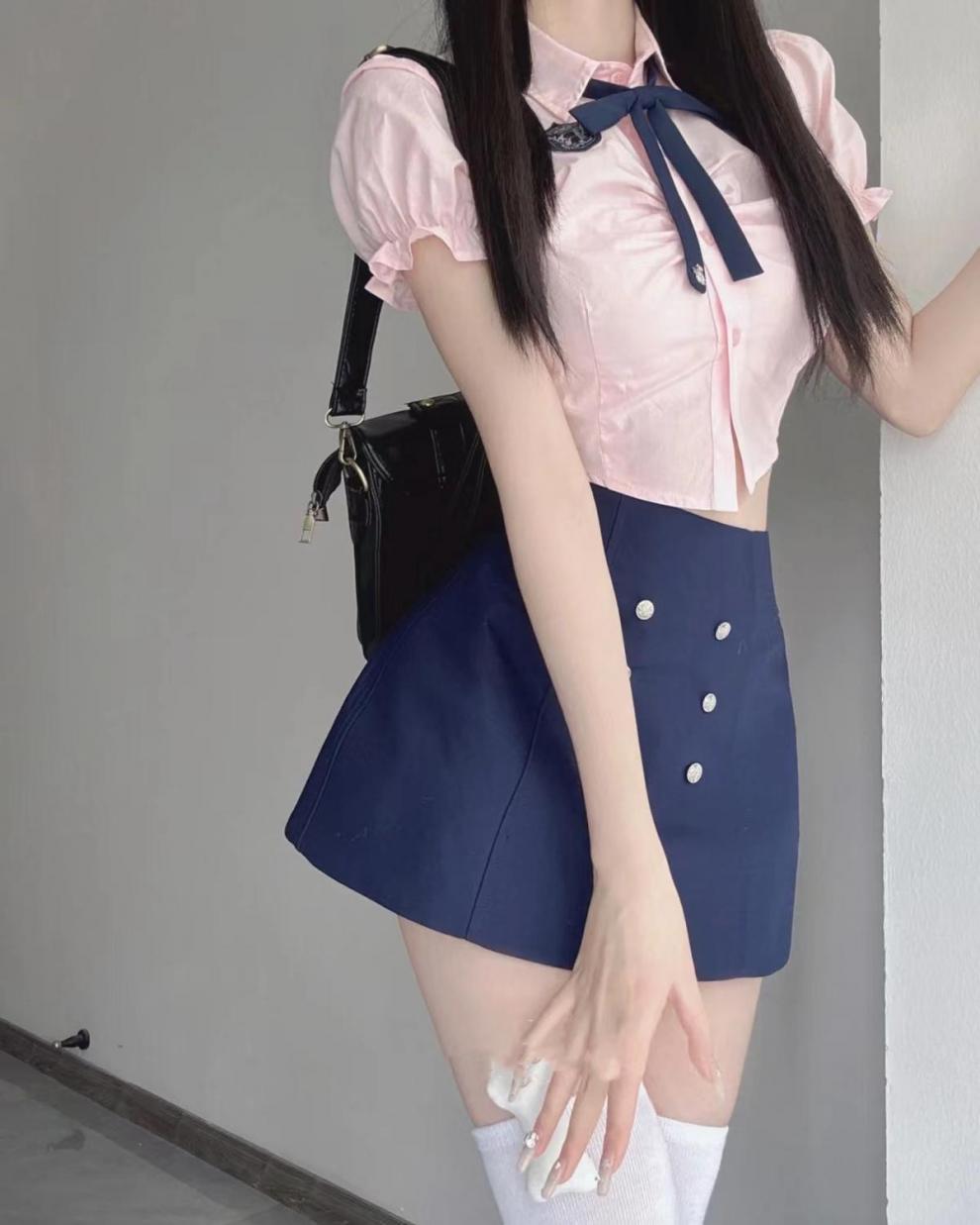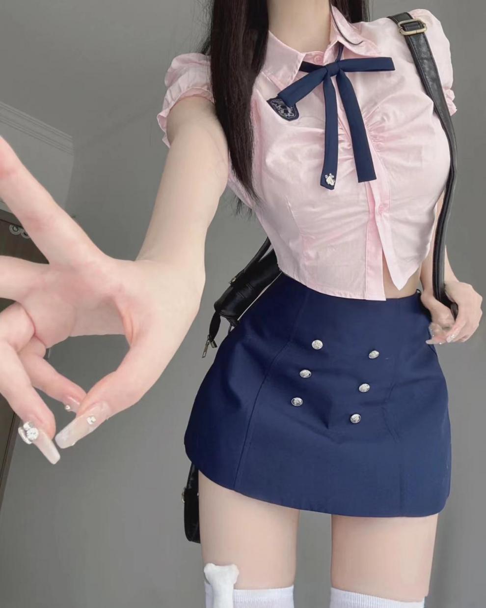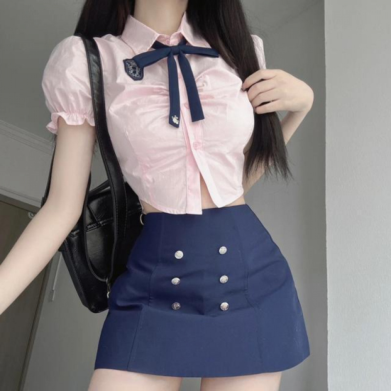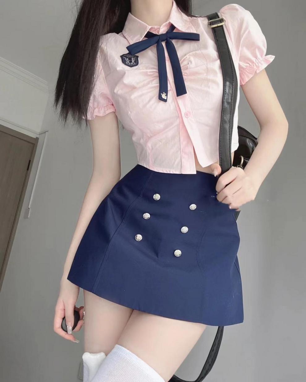 여름 프랑스 아카데미 스타일 슬림 핏 쇼트 셔츠 탑 하이 웨이스트 슬리밍 A 라인 스커트 순수 세트스토어 가기