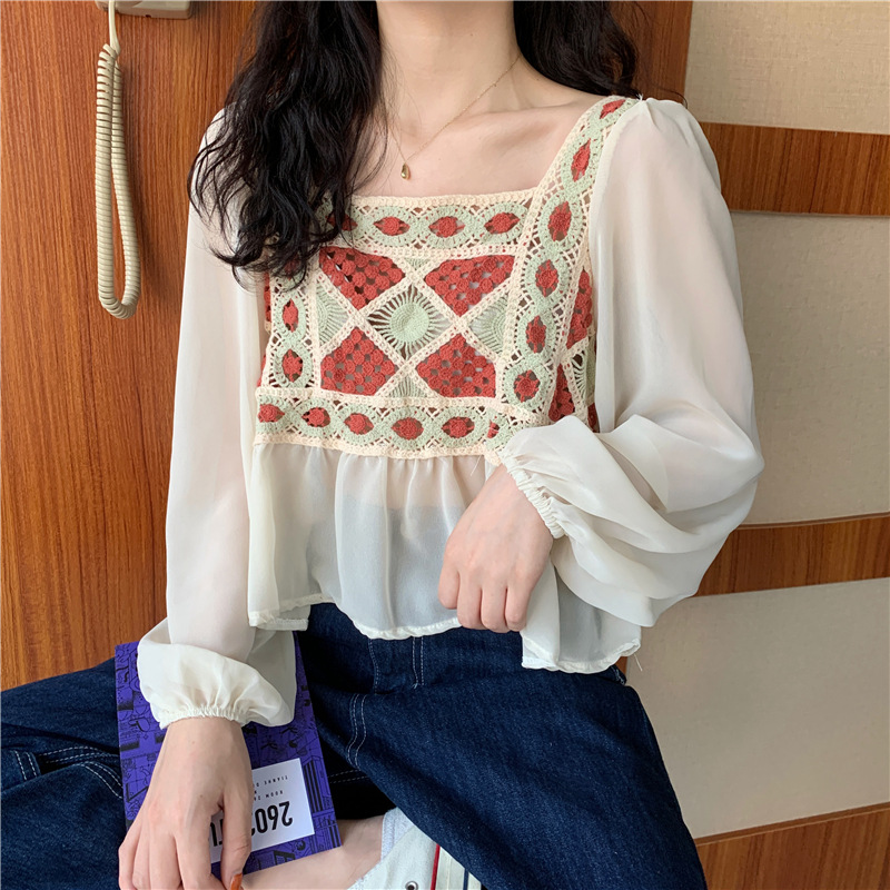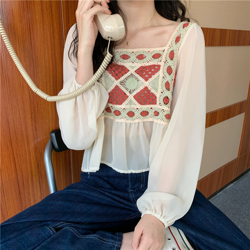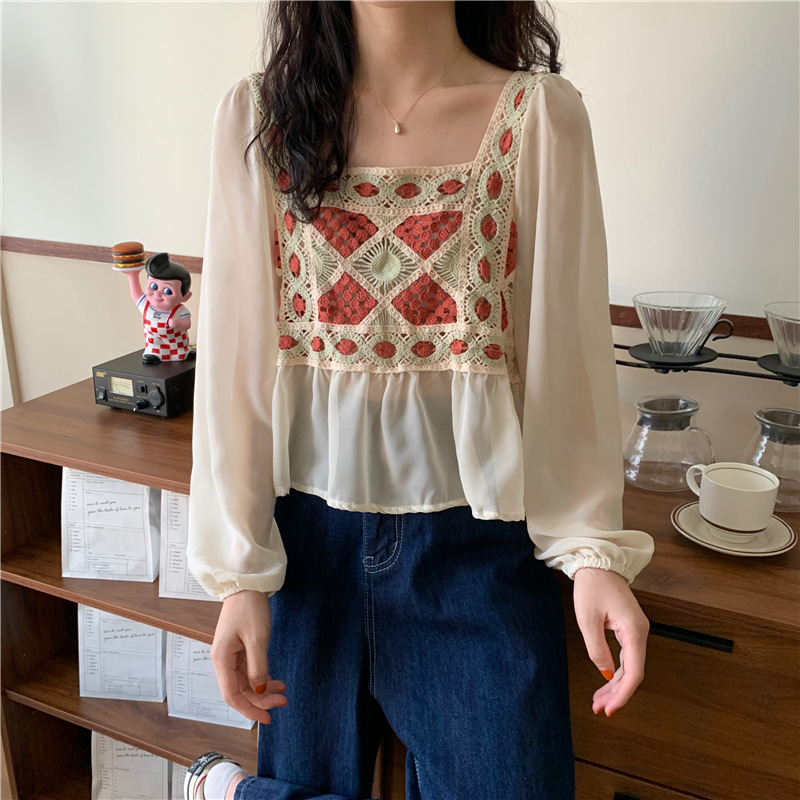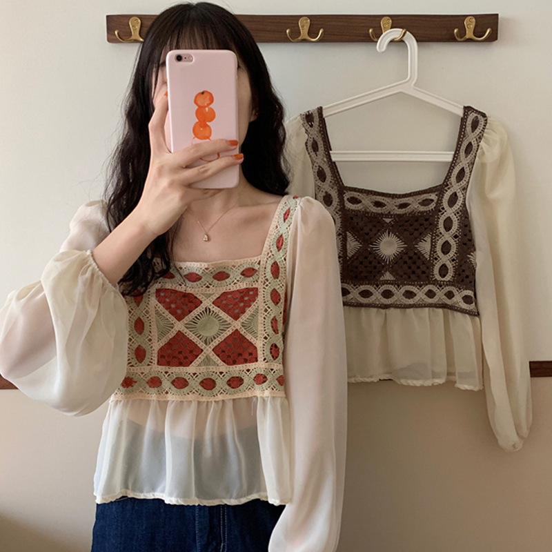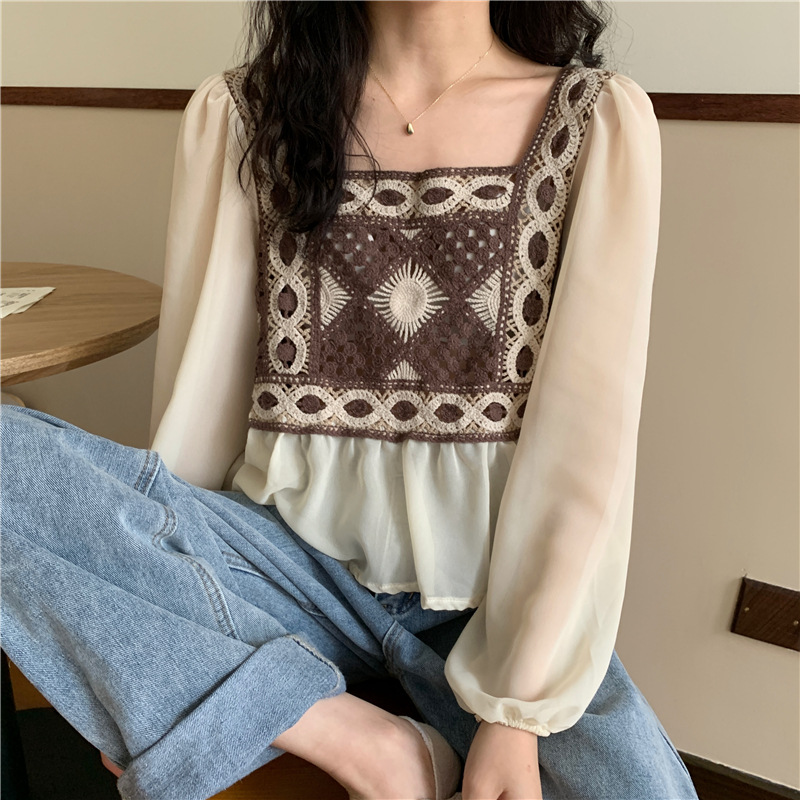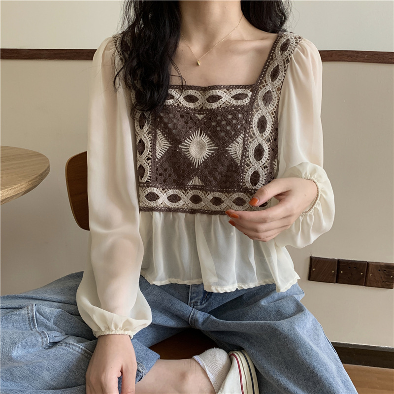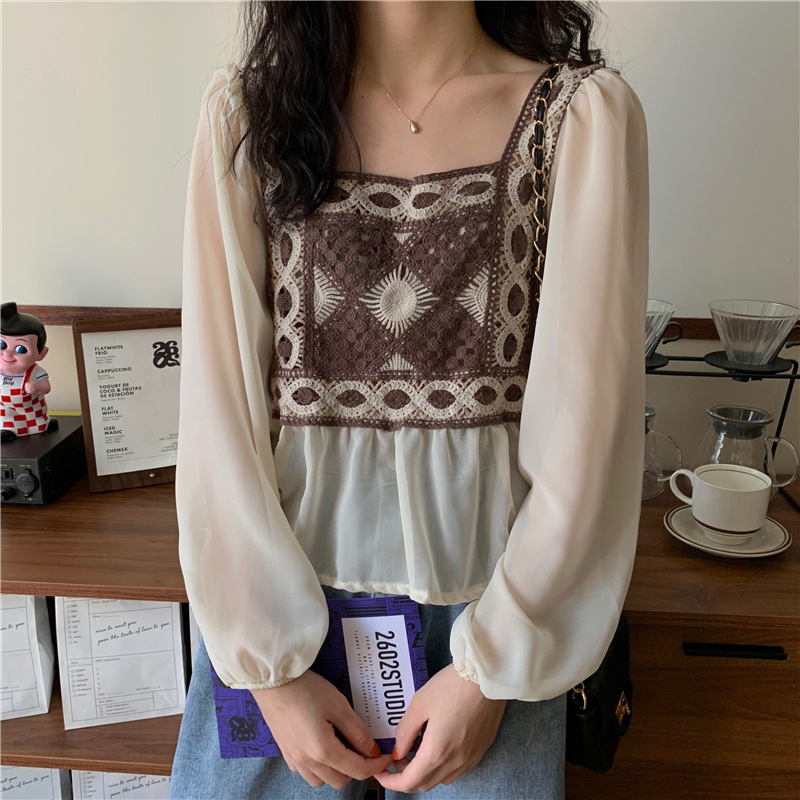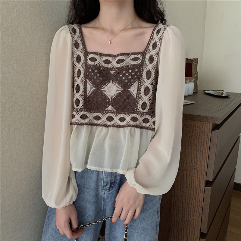시폰 셔츠 여성 2025 년 봄과 가을 새로운 프랑스 레트로 스퀘어 넥 짧은 레이스 바느질 서양식 쉬폰 탑스토어 가기
