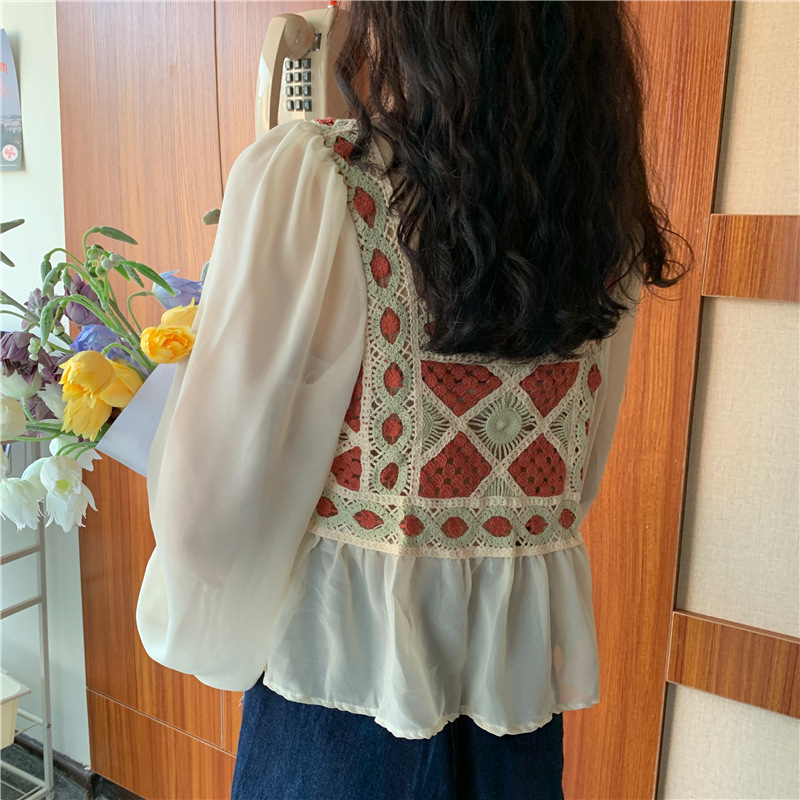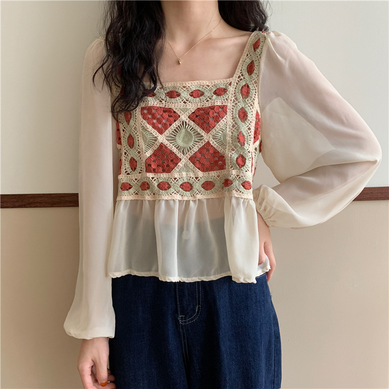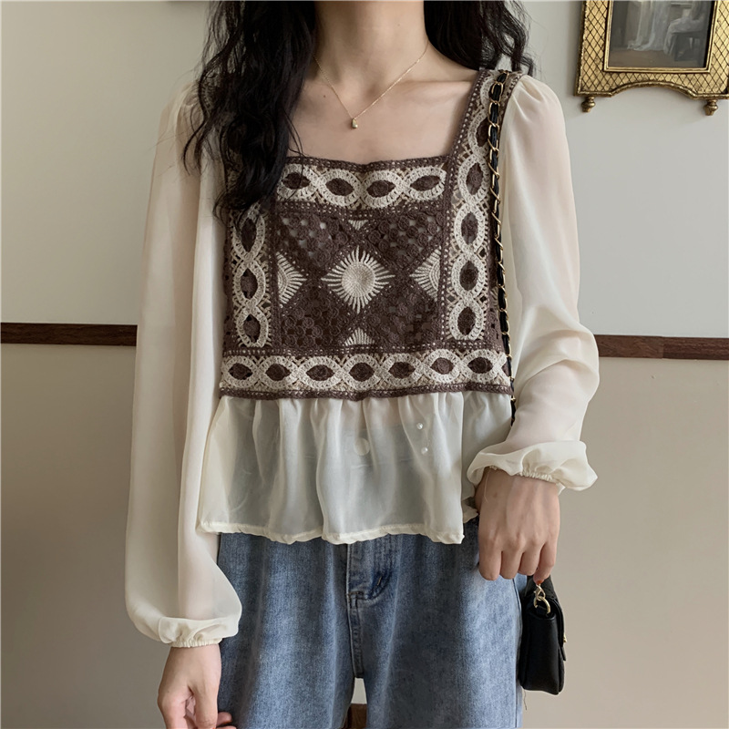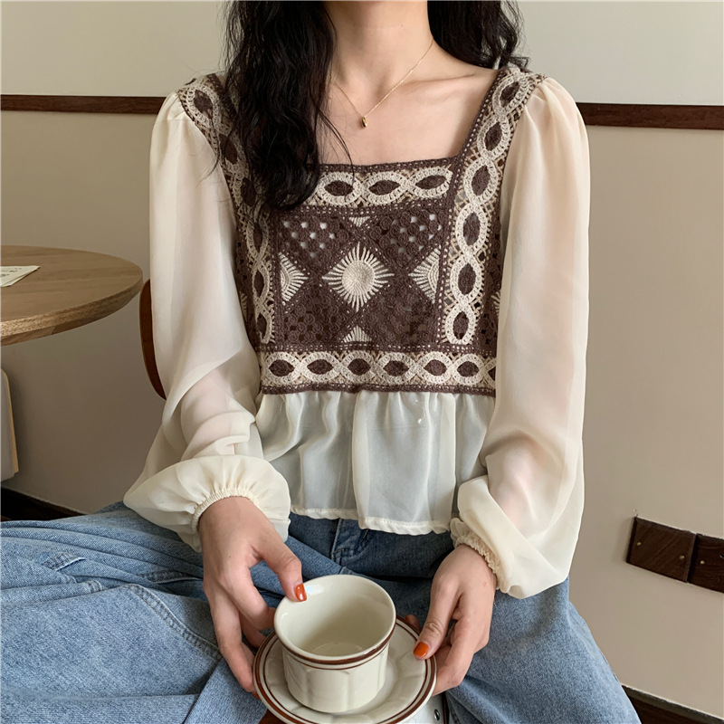 시폰 셔츠 여성 2025 년 봄과 가을 새로운 프랑스 레트로 스퀘어 넥 짧은 레이스 바느질 서양식 쉬폰 탑
