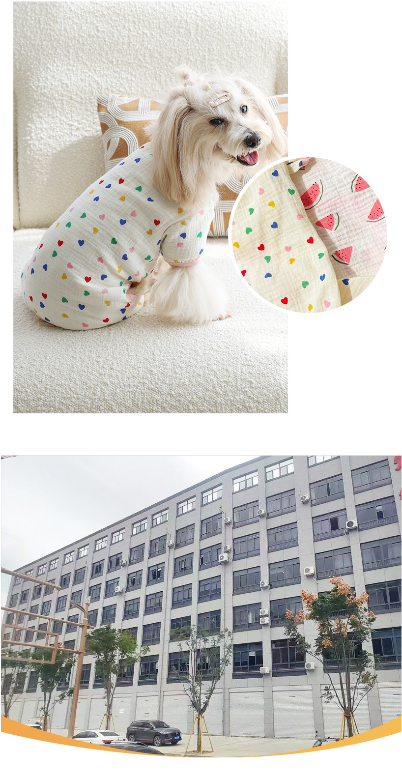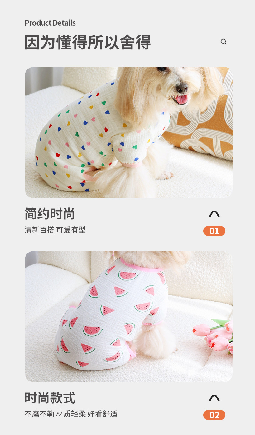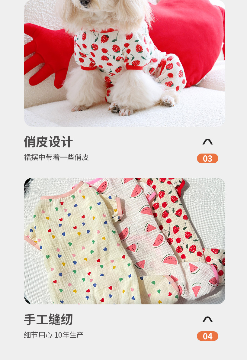 고양이와 개를 위한 보편적인 만화 과일 요소, 부드럽고 통기성이 뛰어나며 피부 친화적인 면 거즈 홈 점프수트, 봄 여름 애완견에게 적합스토어 가기