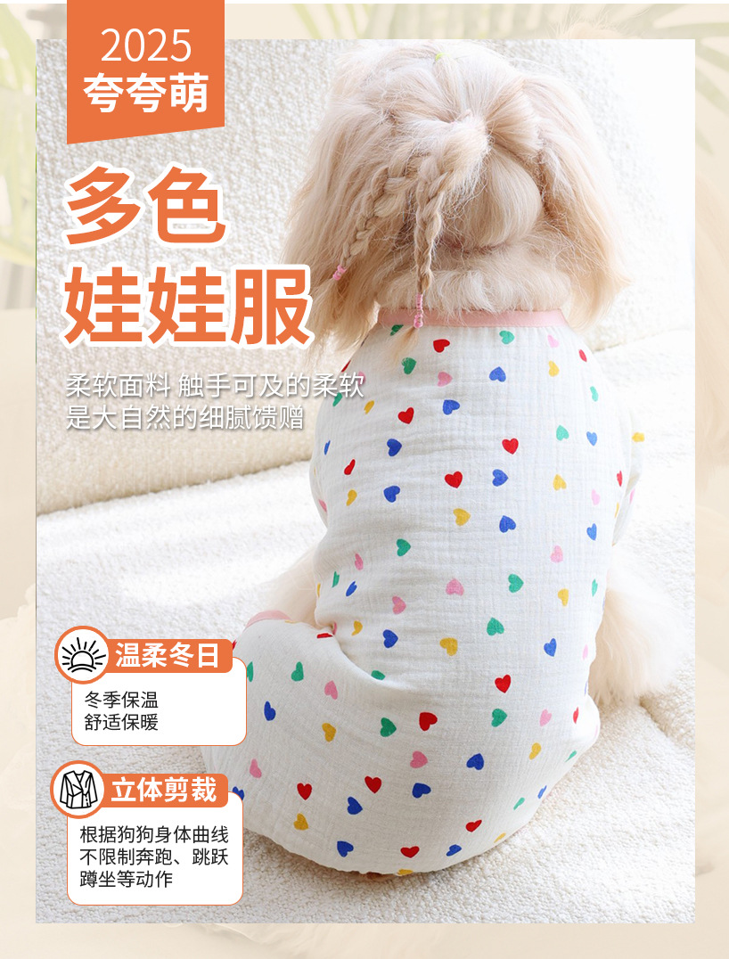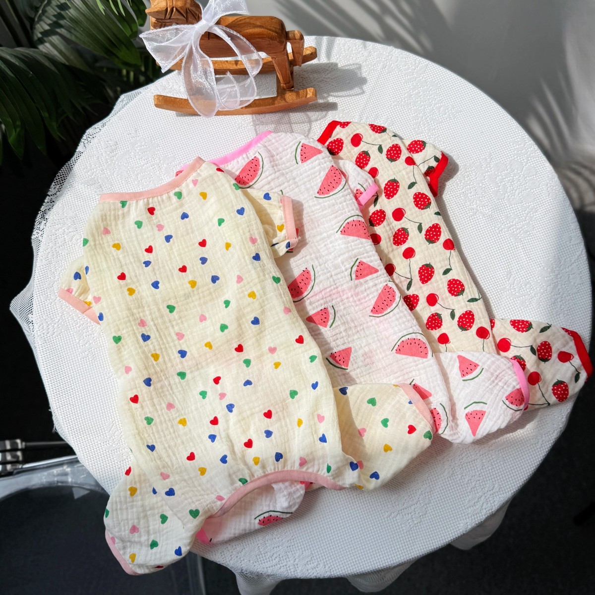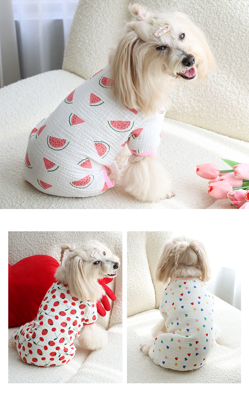 고양이와 개를 위한 보편적인 만화 과일 요소, 부드럽고 통기성이 뛰어나며 피부 친화적인 면 거즈 홈 점프수트, 봄 여름 애완견에게 적합