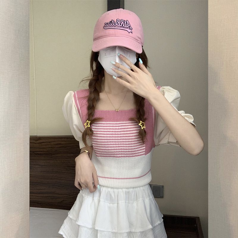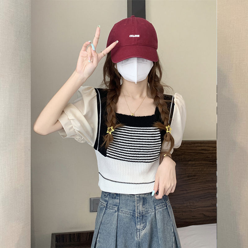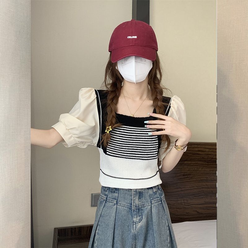 스트라이프 스퀘어 칼라 아이스 실크 니트 반팔 티셔츠 여성용 여름 디자인 센스 니쉬 슬림 핏 슬리밍 쇼트 퍼프 슬리브 탑스토어 가기