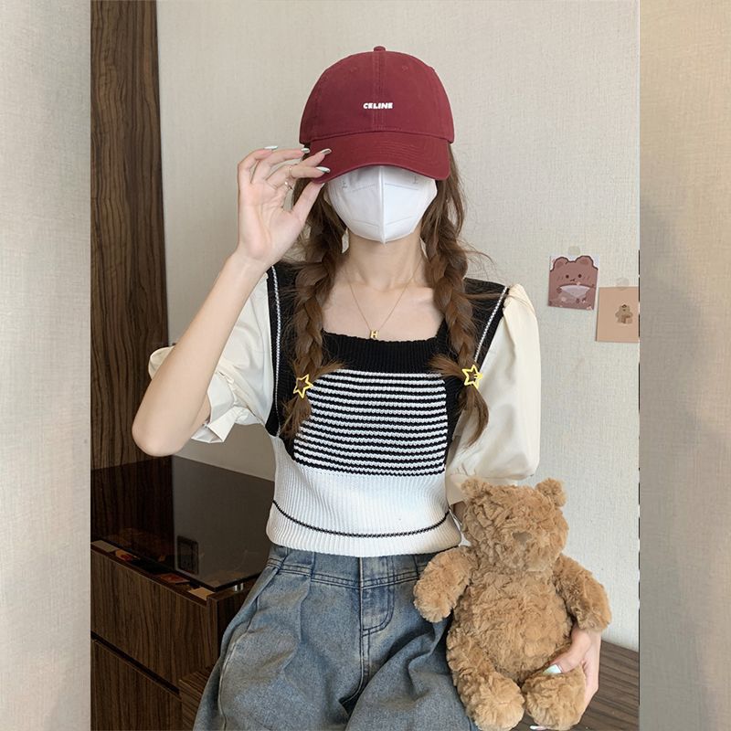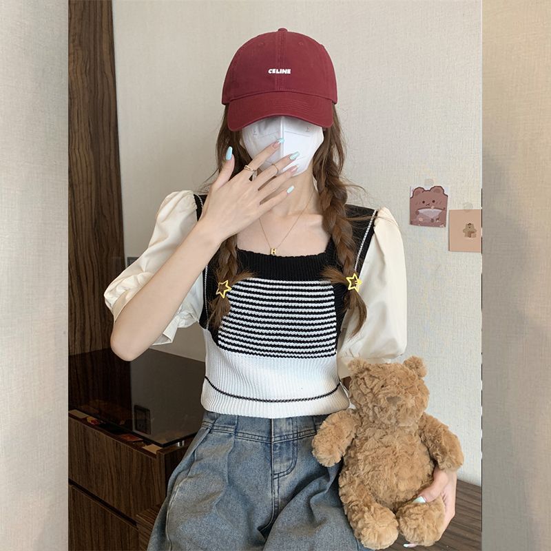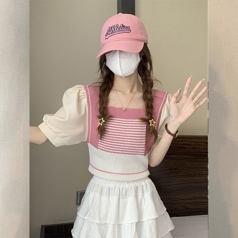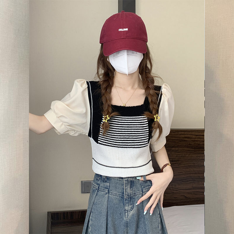 스트라이프 스퀘어 칼라 아이스 실크 니트 반팔 티셔츠 여성용 여름 디자인 센스 니쉬 슬림 핏 슬리밍 쇼트 퍼프 슬리브 탑