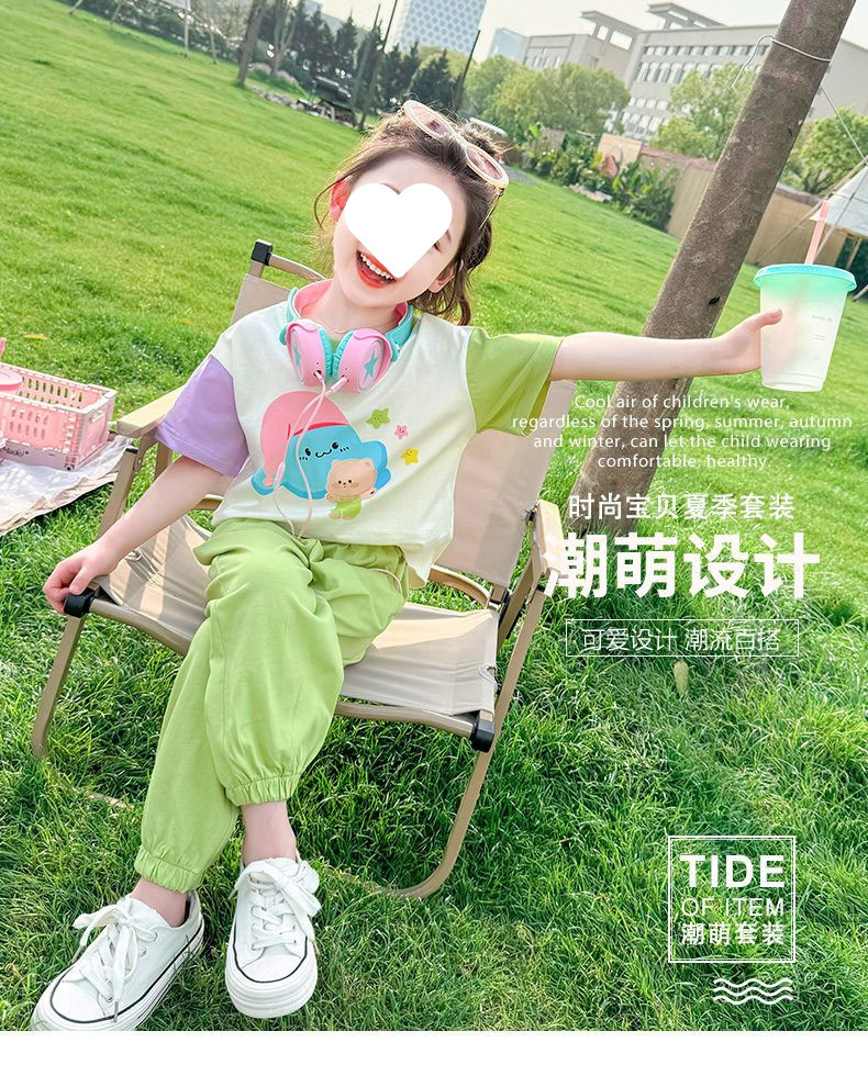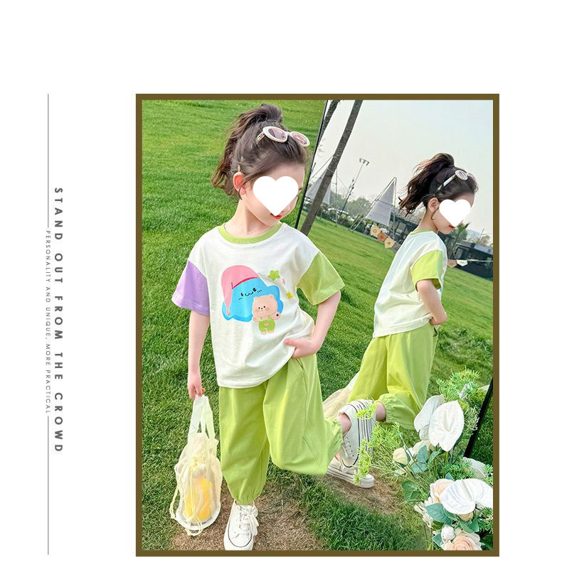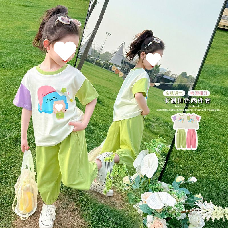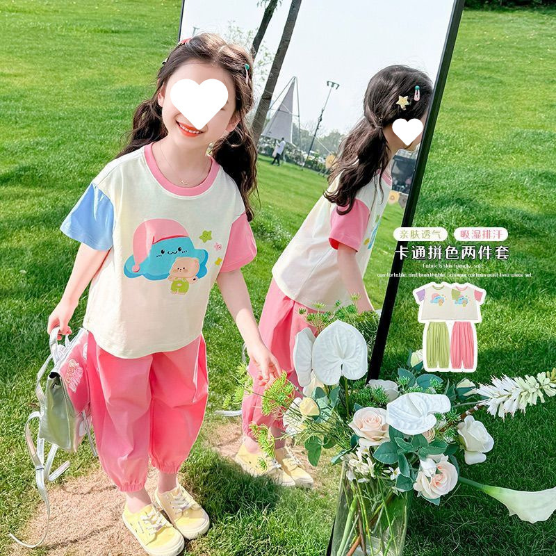 Cuhk 어린이 면화 여름 2025 새로운 소녀 짧은 소매 세트 소녀 학생 귀여운 컬러 매칭 여름 투피스 세트