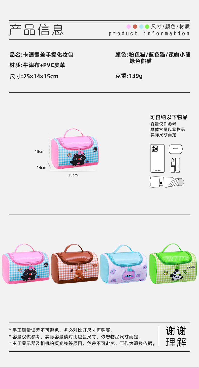 귀여운 팬더 PU 방수 휴대용 세면도구 가방 대용량 분할형 입체 수납 가방 여행용 휴대용 화장품 가방