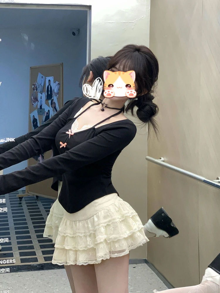 순수한 욕망 레이스 바느질 목 탑 여성의 봄과 여름 새로운 높은 허리 슬리밍 푹신한 케이크 스커트 세트 여성 투피스 세트