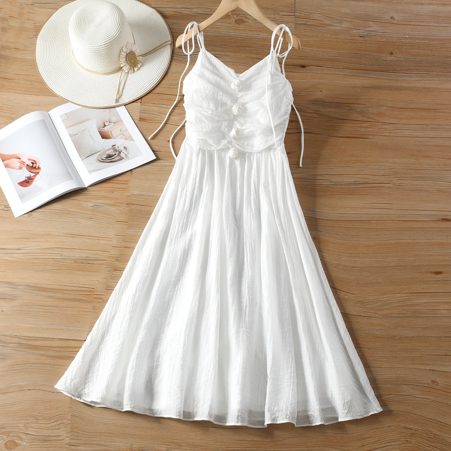 프랑스 틈새 디자인 감각 주름 장미 장식 스트랩 원피스 여성의 여름 허리 슬리밍 휴가 스트랩 원피스