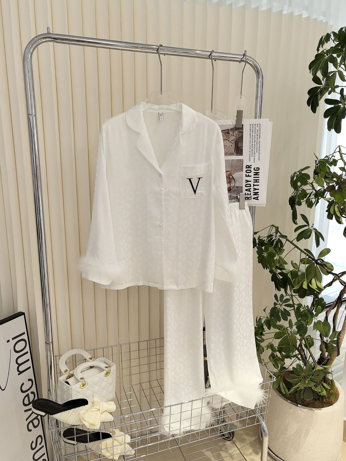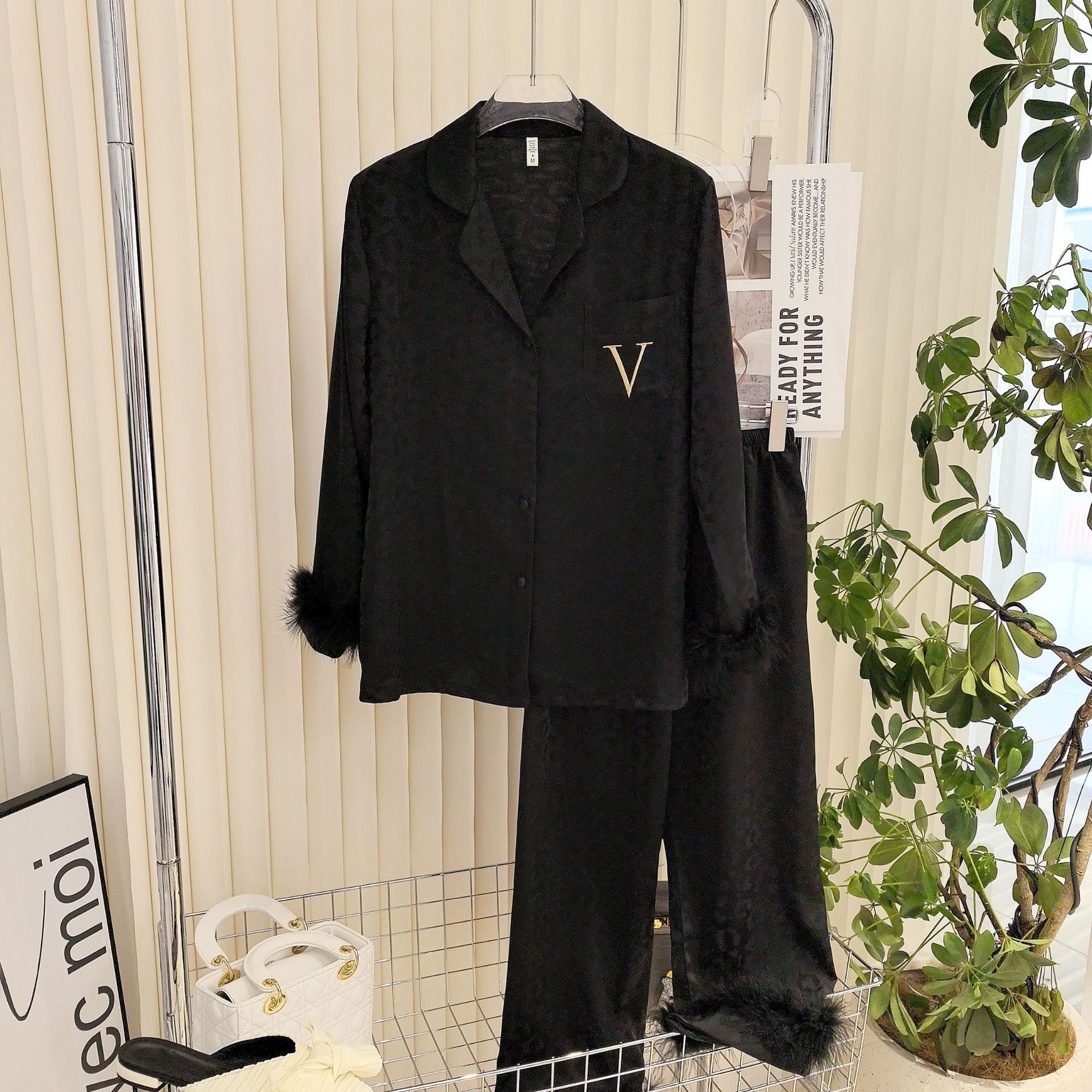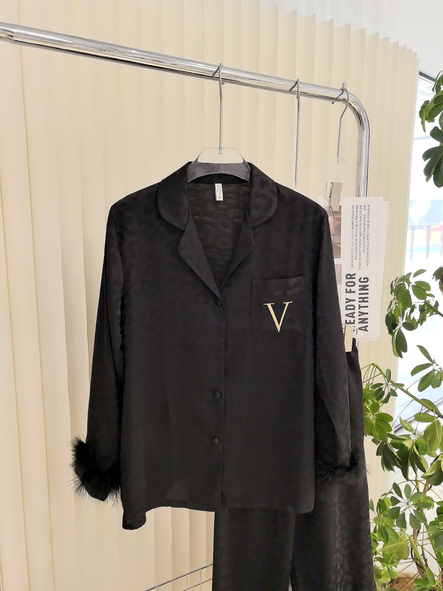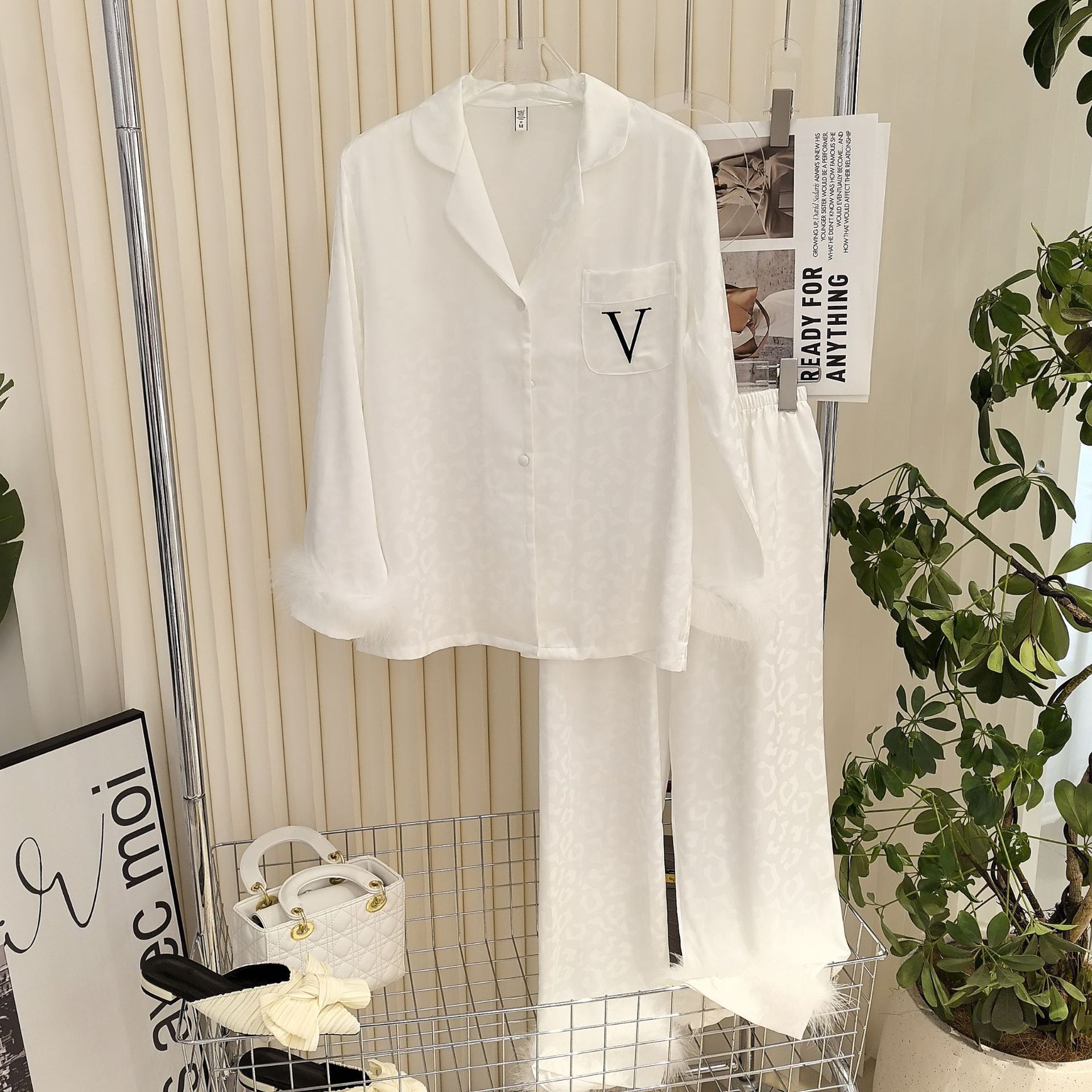 아이스 실크 잠옷 여성의 봄과 여름 플러스 사이즈 얇은 느슨한 표범 깃털 긴 소매 바지 달콤한 세트 입을 수 있습니다스토어 가기