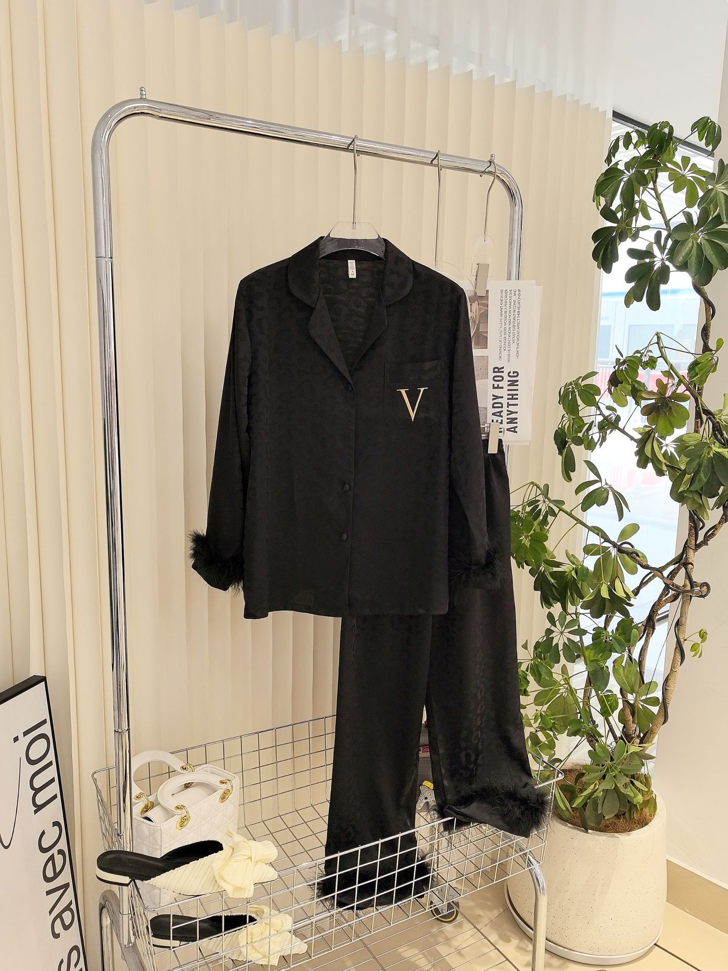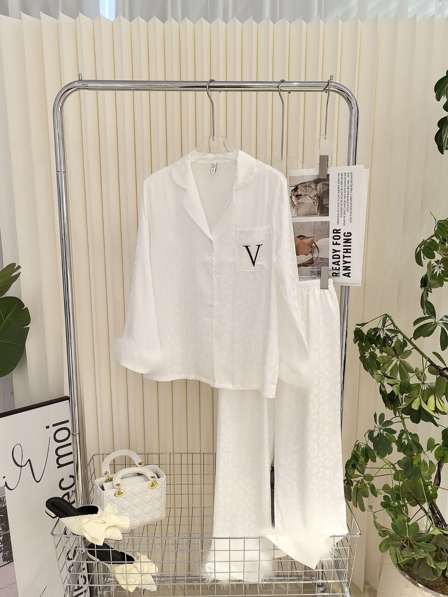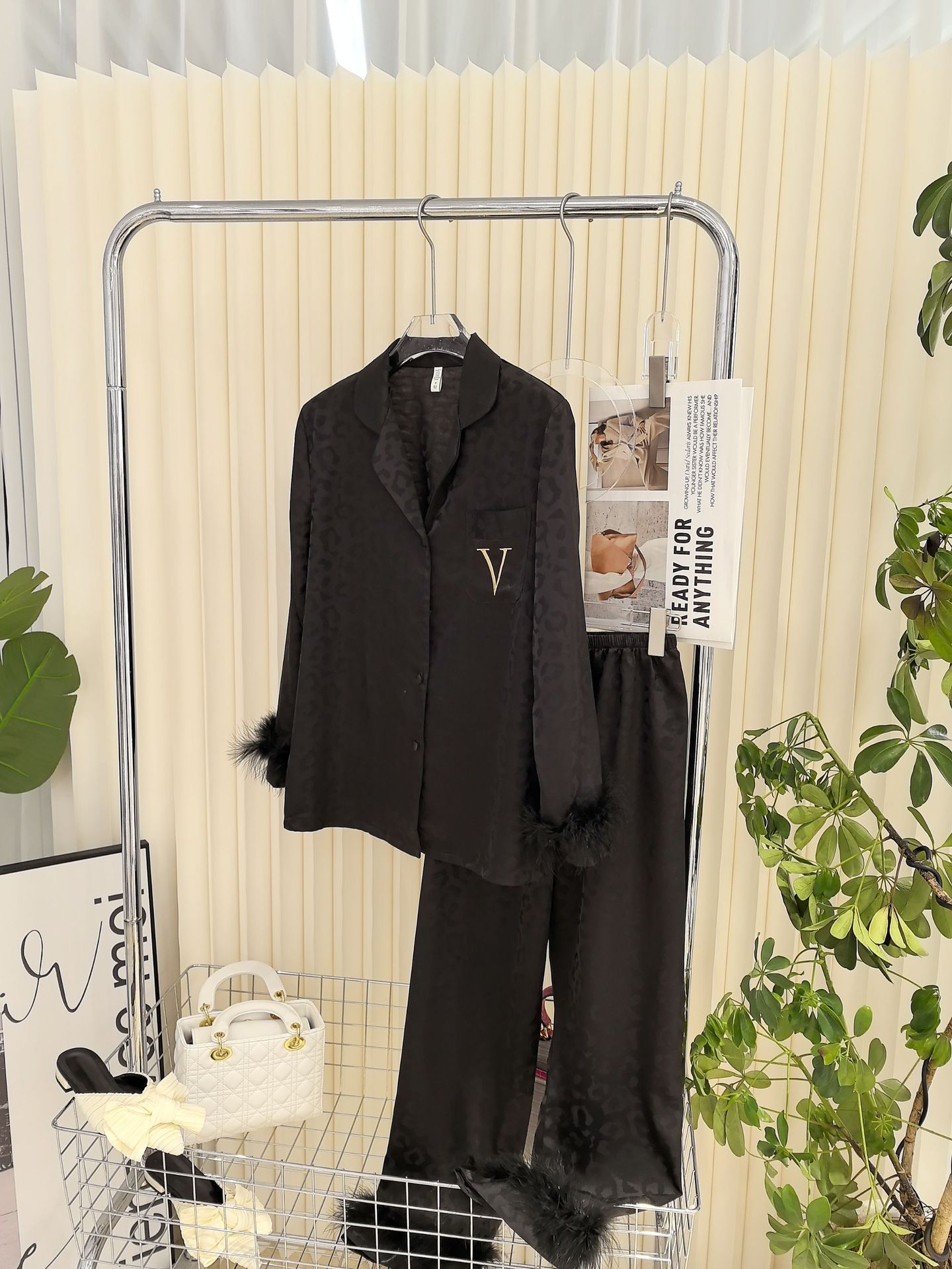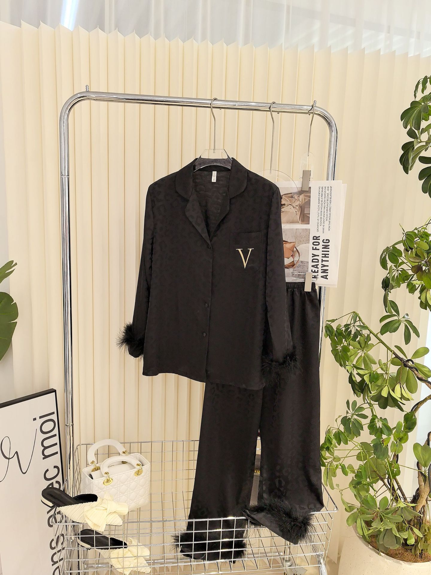 아이스 실크 잠옷 여성의 봄과 여름 플러스 사이즈 얇은 느슨한 표범 깃털 긴 소매 바지 달콤한 세트 입을 수 있습니다스토어 가기