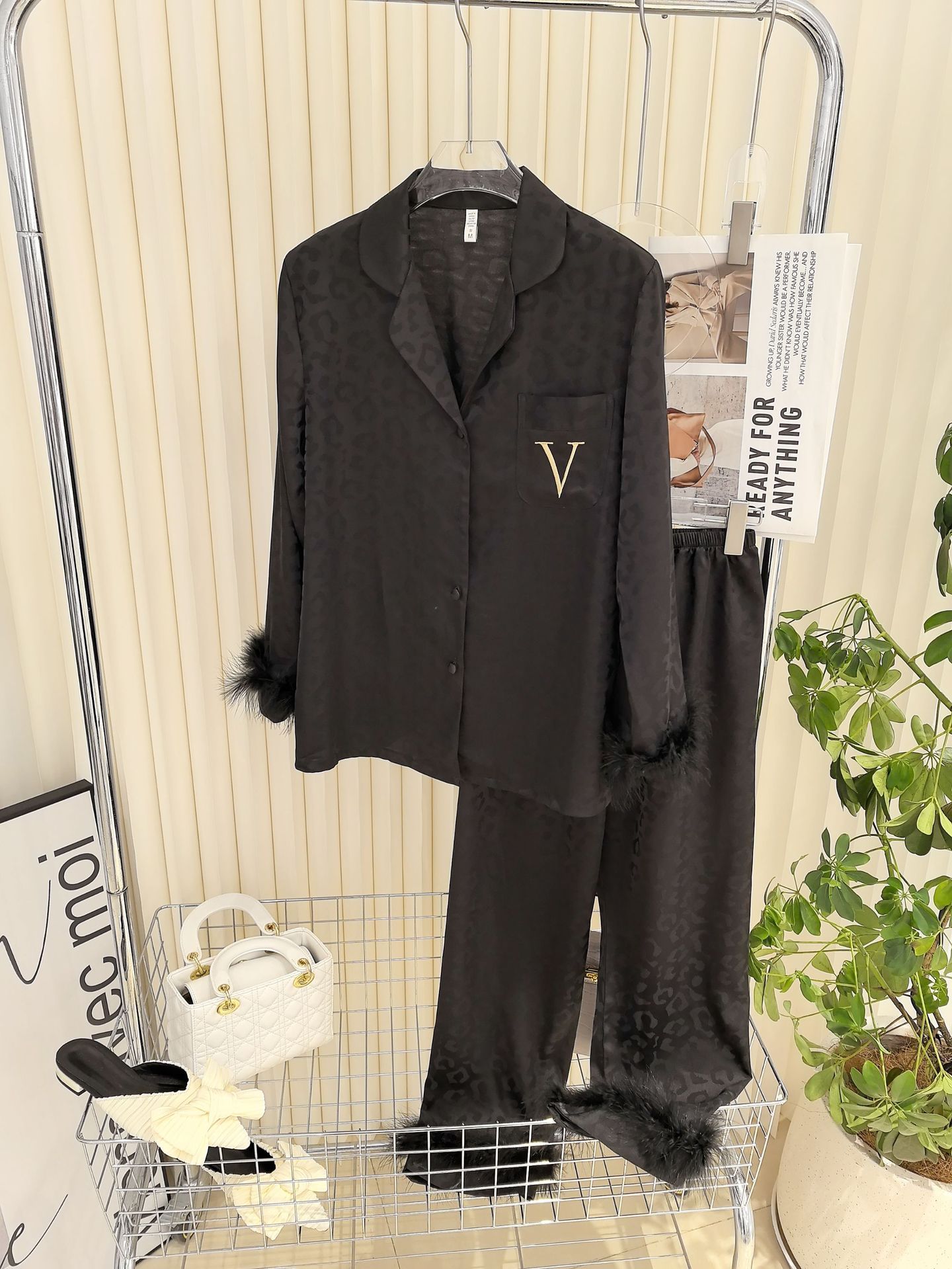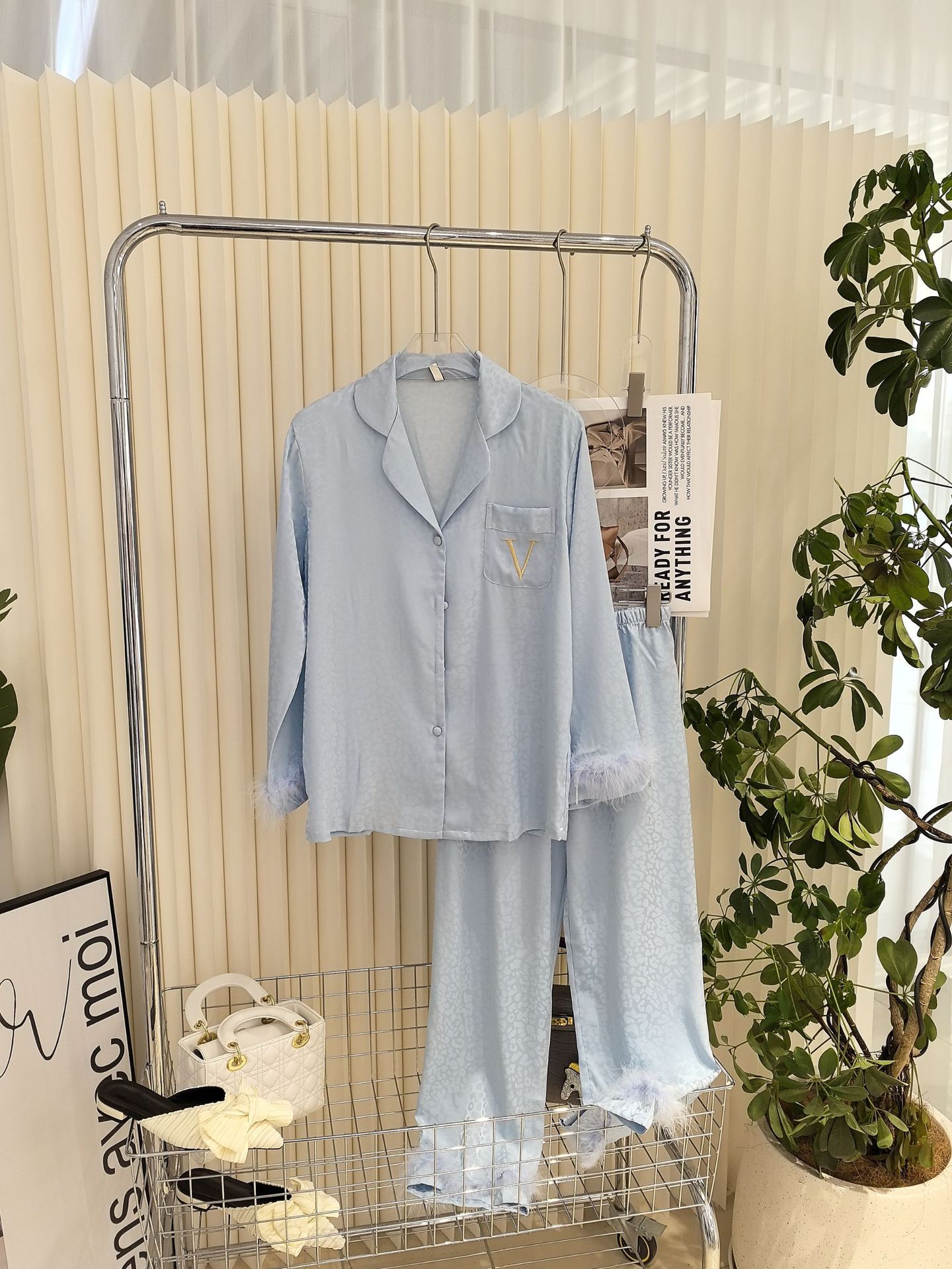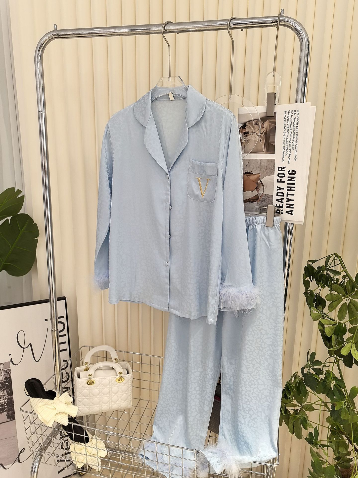 아이스 실크 잠옷 여성의 봄과 여름 플러스 사이즈 얇은 느슨한 표범 깃털 긴 소매 바지 달콤한 세트 입을 수 있습니다