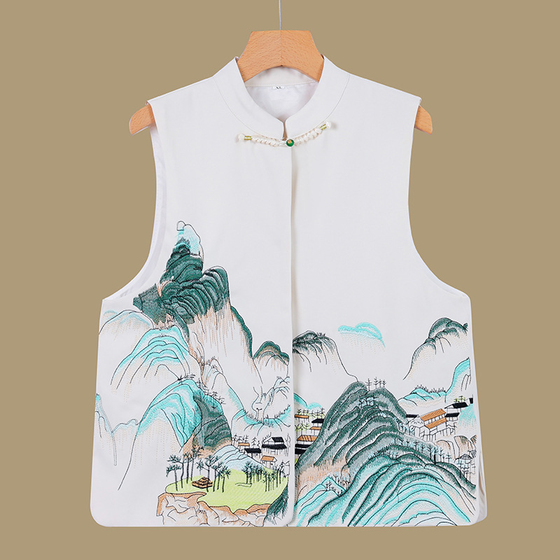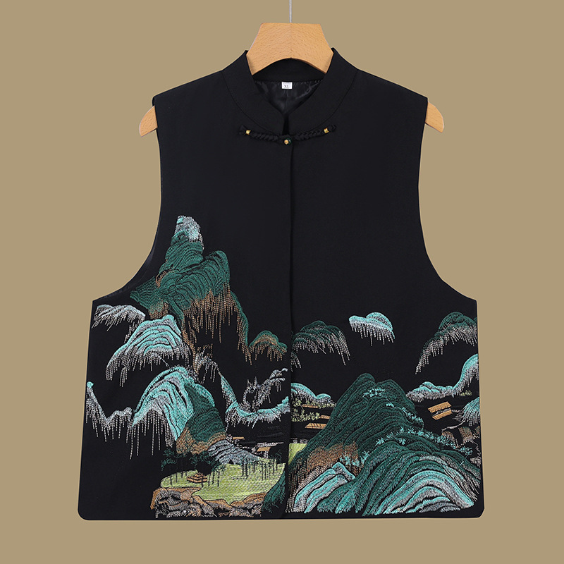 2025 봄과 가을 새로운 중국 스타일 복고풍 자수 조끼 여성 수직 칼라 버클 국가 스타일 우아한 키퍼 풍경 그림 키퍼