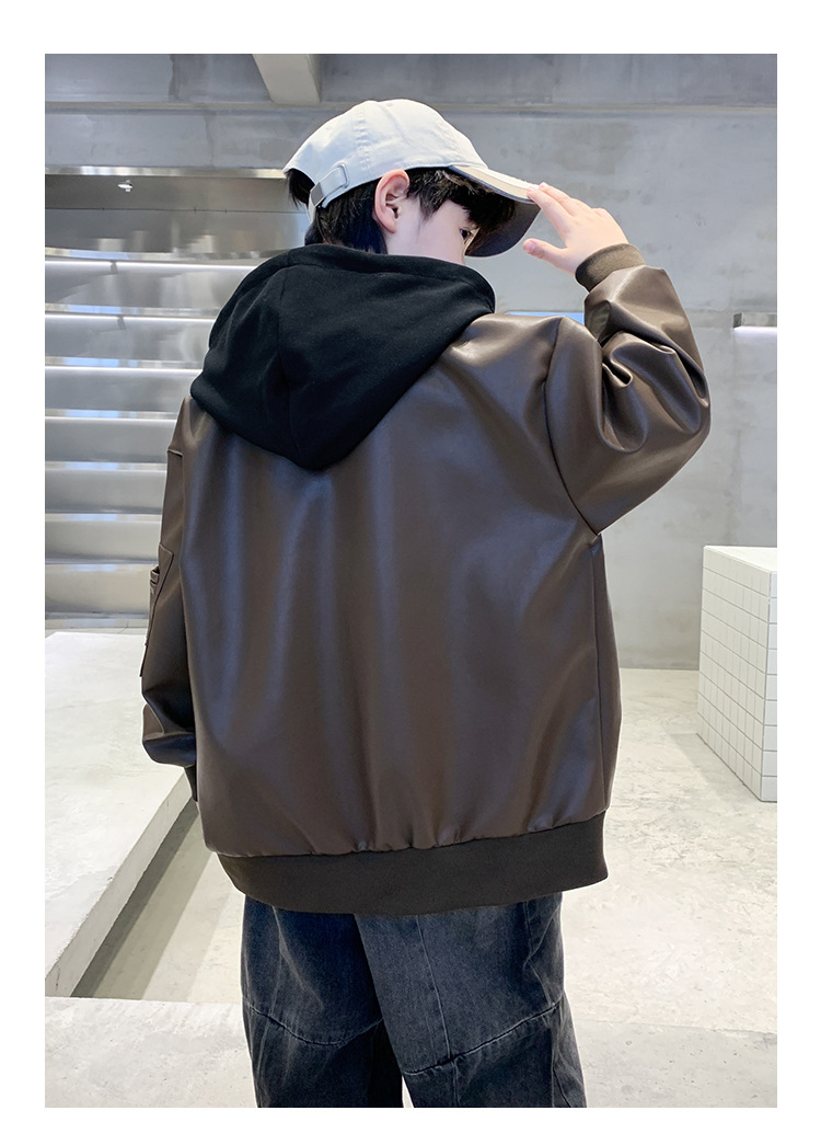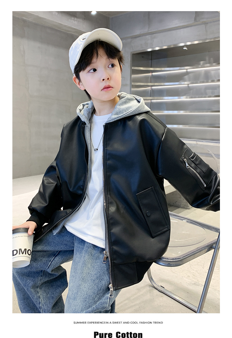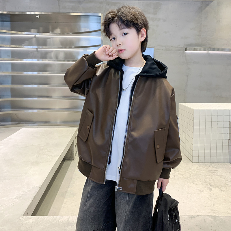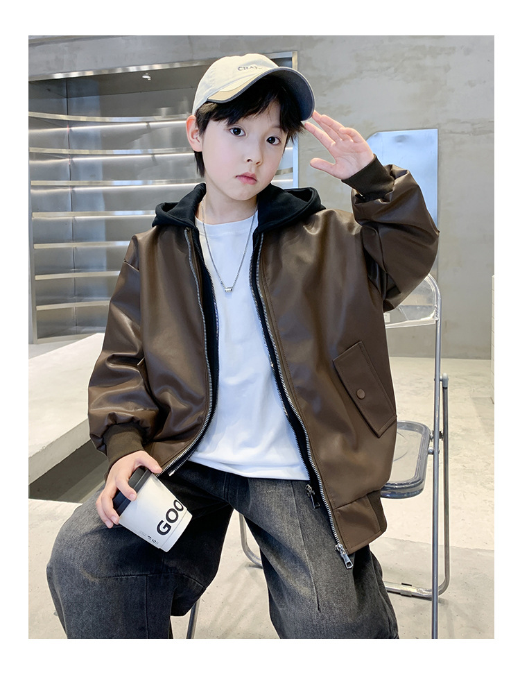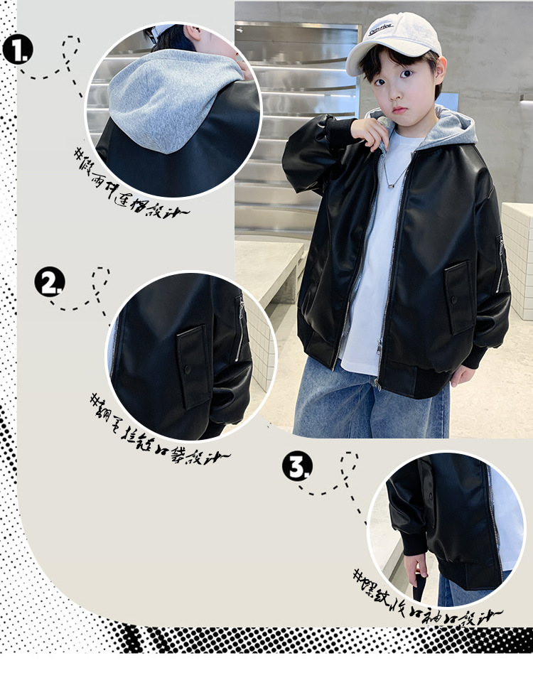 소년 코트 봄과 가을 2025 새로운 소년 어린이 가죽 자켓 서양식 중대형 키즈 후드 캐주얼 자켓