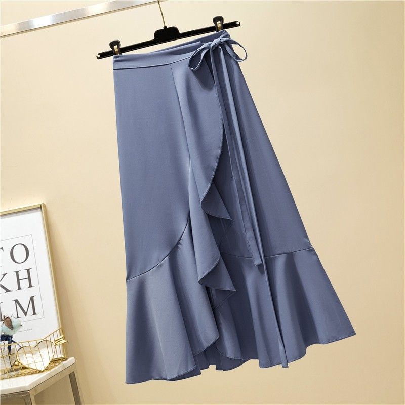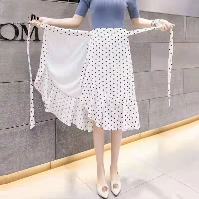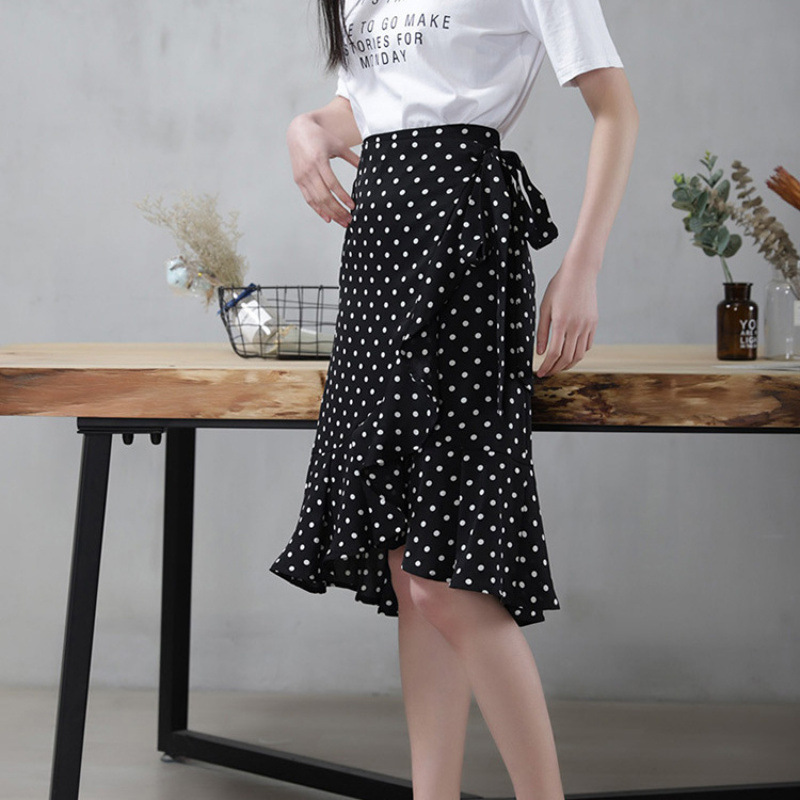 높은 허리 피쉬 테일 스커트 여름 새로운 원피스 웨이브 도트 스커트 시폰 불규칙한 스트랩 스커트 슬림스토어 가기