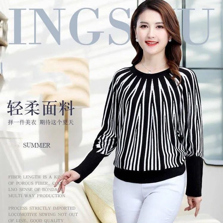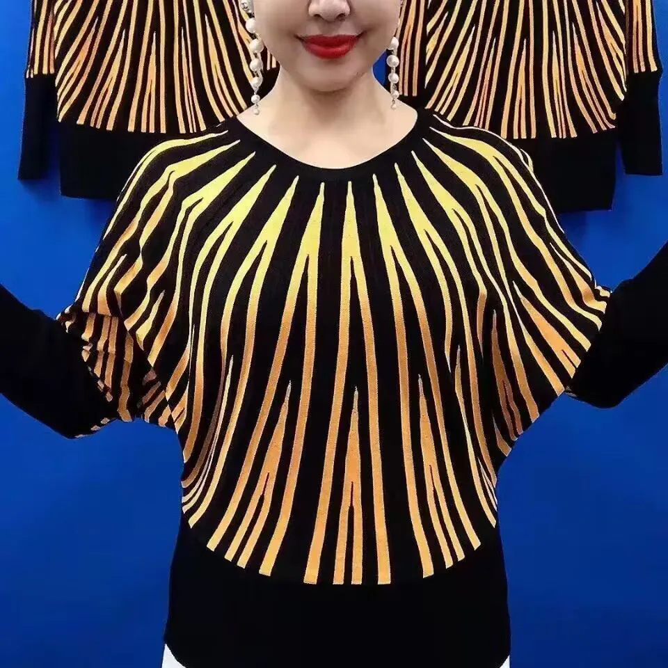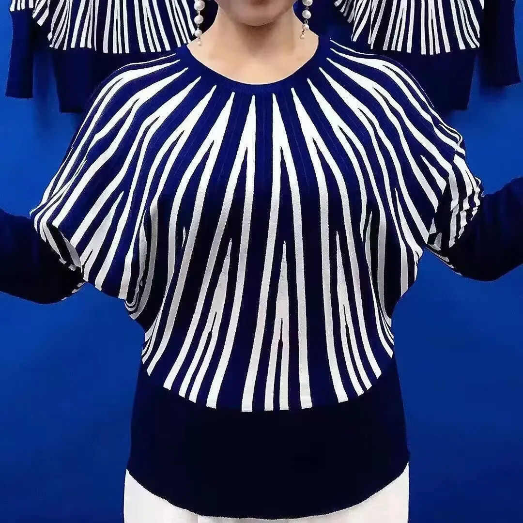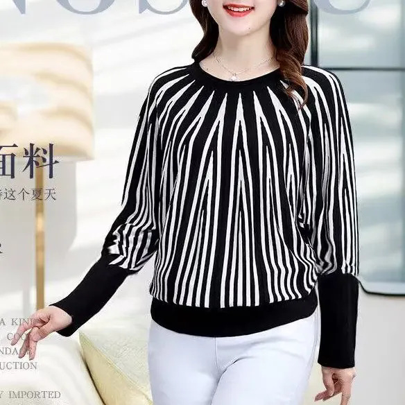 중년 및 노인 여성의 새로운 봄과 가을 탑을위한 기본 셔츠 줄무늬 노화 감소 느슨한 니트 셔츠 민족 스타일 티셔츠 배팅 셔츠